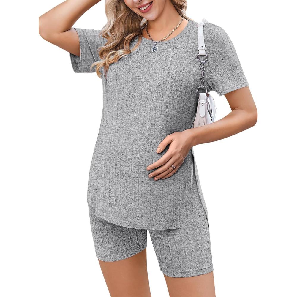 Get the Ekouaer Maternity Sets 2 Piece Outfits Ribbed Knit Short Sleeve Shirts and Biker Shorts Pregnancy Loungewear Mama Clothes(Light Grey) you want at a discounted price during our markdown sale event.