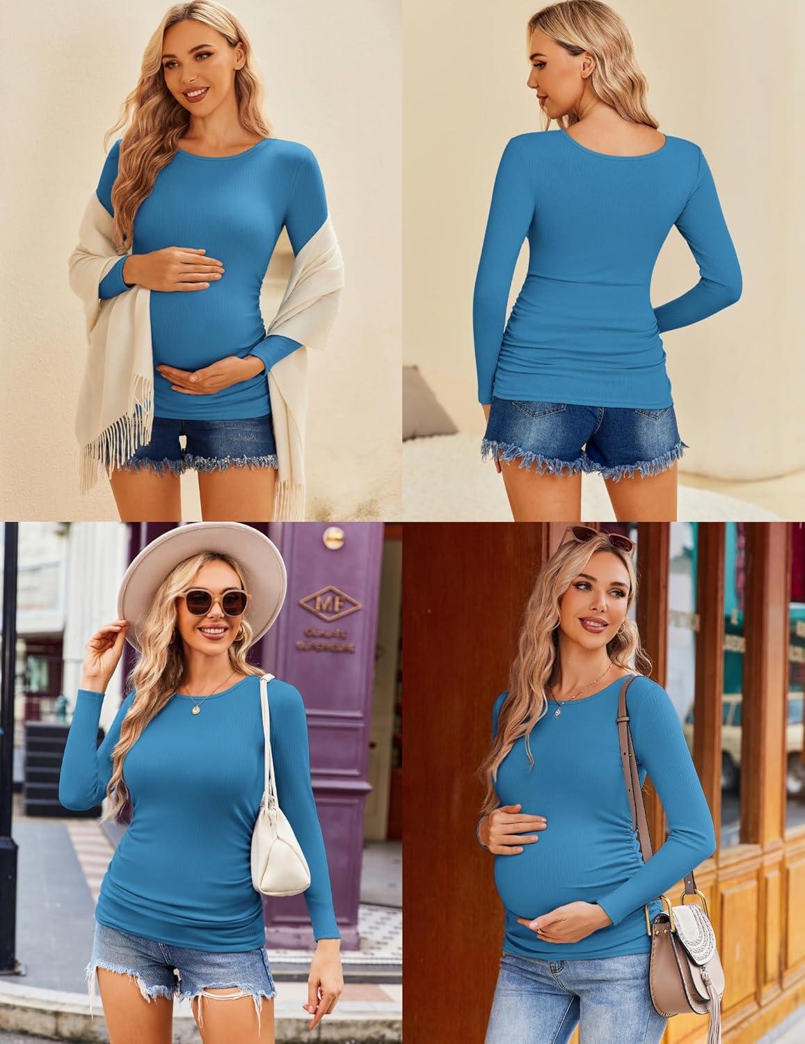 Ekouaer Maternity Shirts 3 Packs Women Long Sleeve Pregnancy Tee Tops Tunic Blouse Ribbed Side Ruched Mama Clothes S-XXL(Black/Green/Teal)
