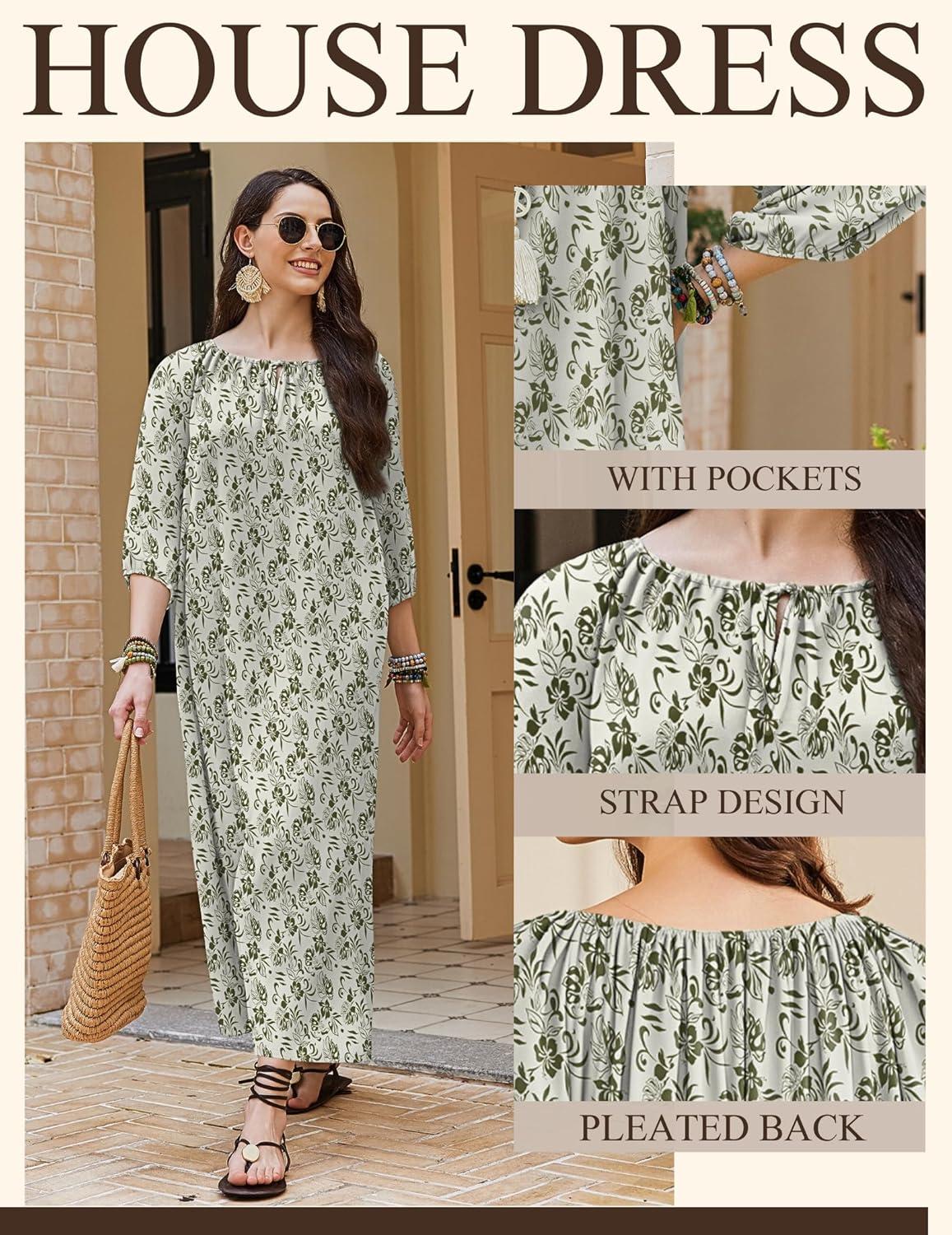 Ekouaer Moo Moos for Women 3/4 Sleeve Long Nightgowns House Dresses with Pocket S-3XL(Green Leaves)