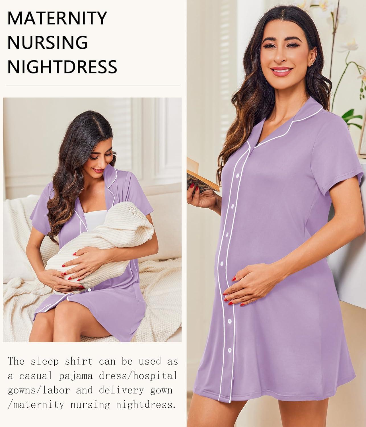 Ekouaer Nightgowns for Women Button Down Night Gowns Short Sleeve Night Dress Notch Collar Sleep Shirt Pajama Dress S-3XL(Lavender)