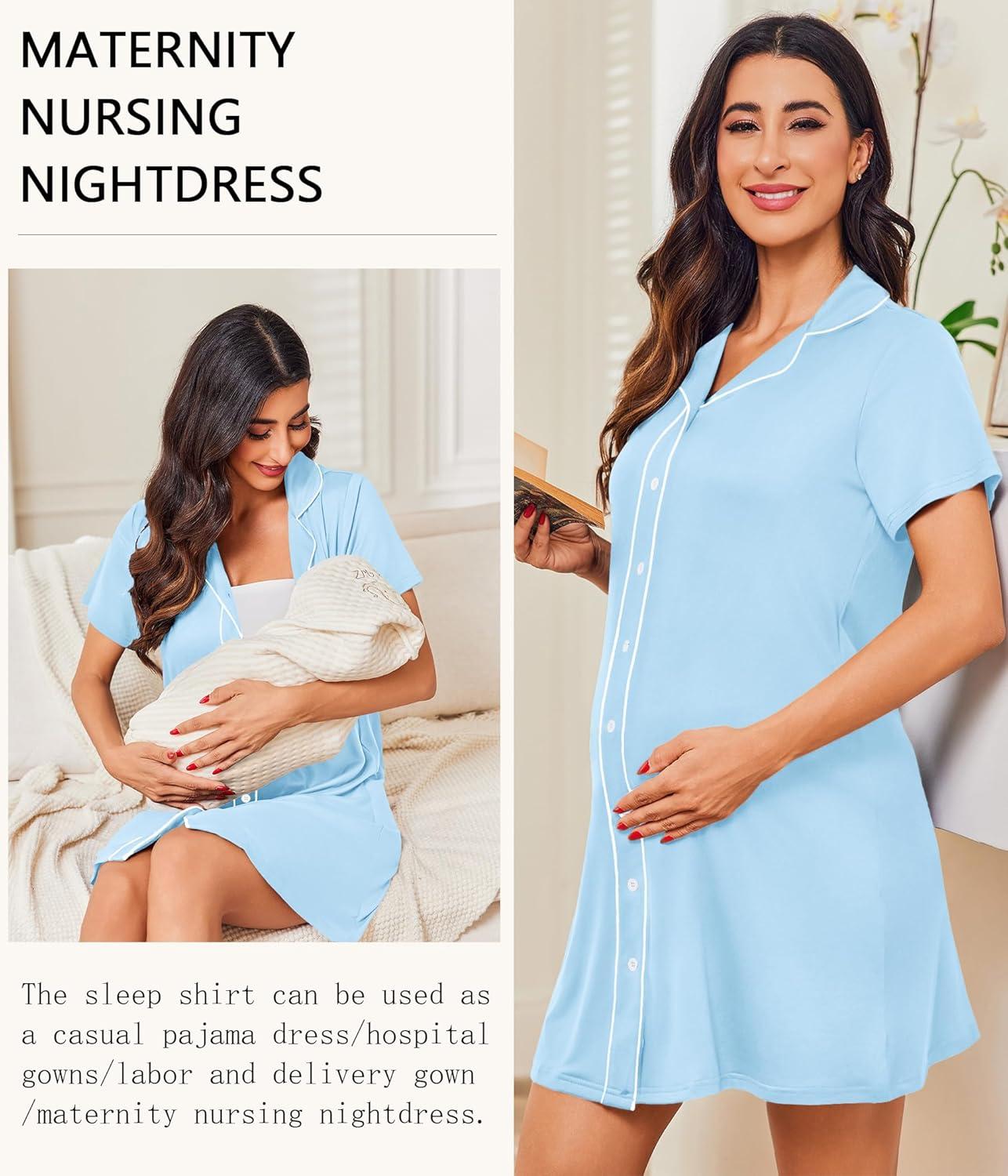 Ekouaer Nightgowns for Women Button Down Night Gowns Short Sleeve Night Dress Notch Collar Sleep Shirt Pajama Dress S-3XL(Light Blue)