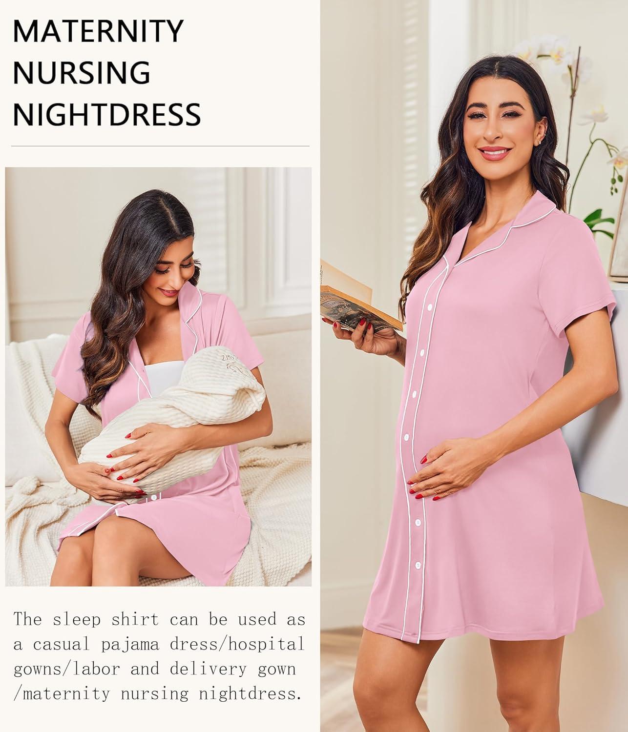 Ekouaer Nightgowns for Women Button Down Night Gowns Short Sleeve Night Dress Notch Collar Sleep Shirt Pajama Dress S-3XL(Pink)