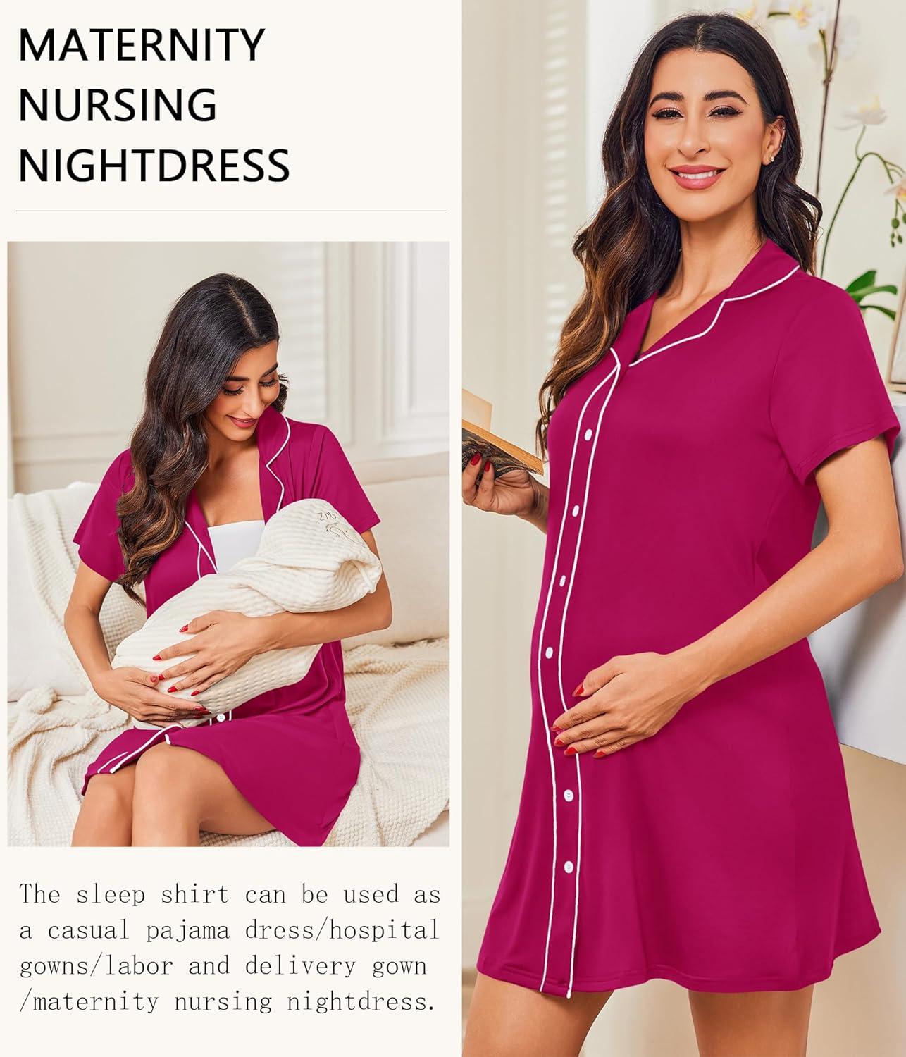 Ekouaer Nightgowns for Women Button Down Night Gowns Short Sleeve Night Dress Notch Collar Sleep Shirt Pajama Dress S-3XL(Rose Red)