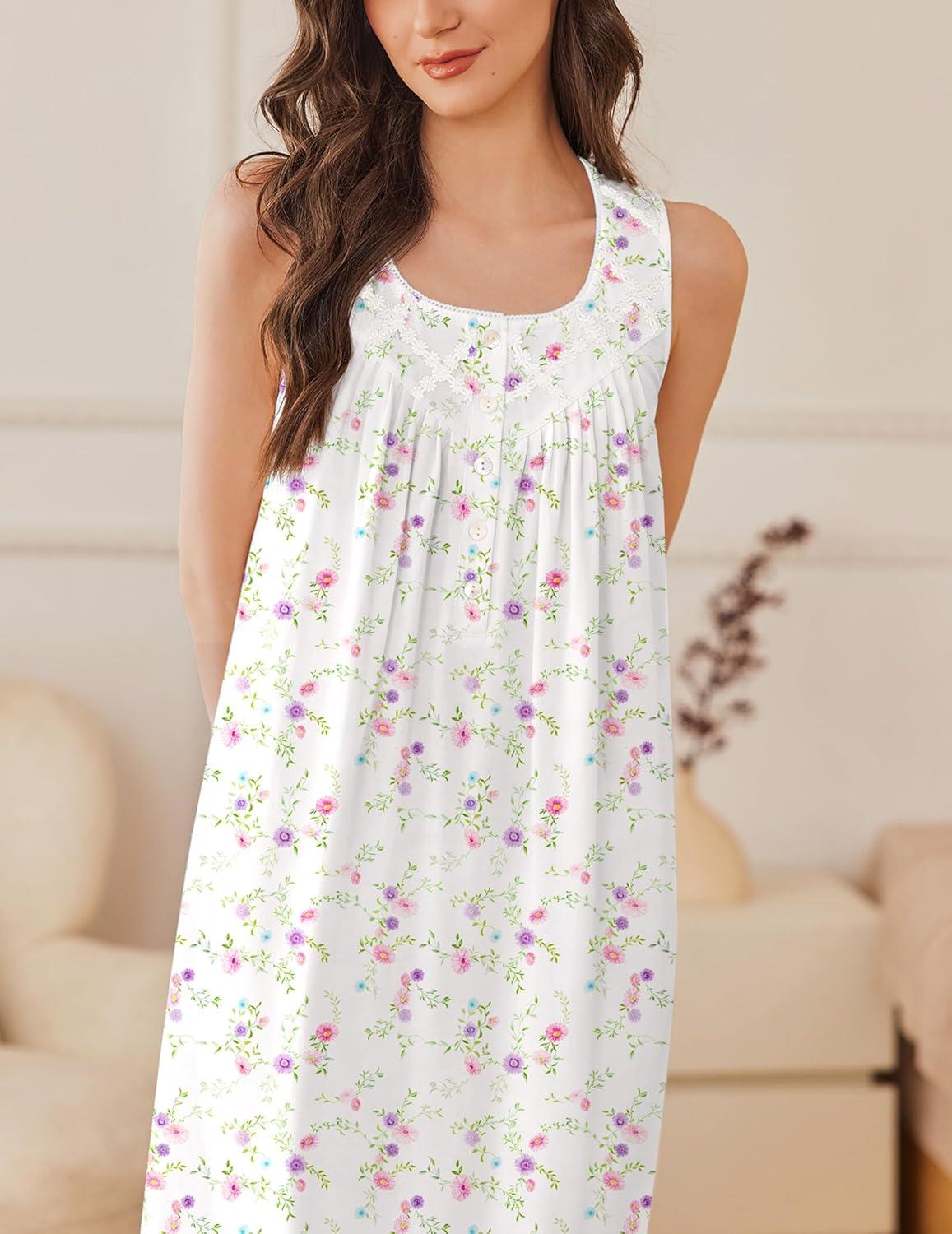Ekouaer Nightgowns for Women Cotton Long Night Gown Sleeveless Sleep Dress Victorian Nightdress Ladies Sleepwear S-XXXL(White Pink & Lilac Florals)