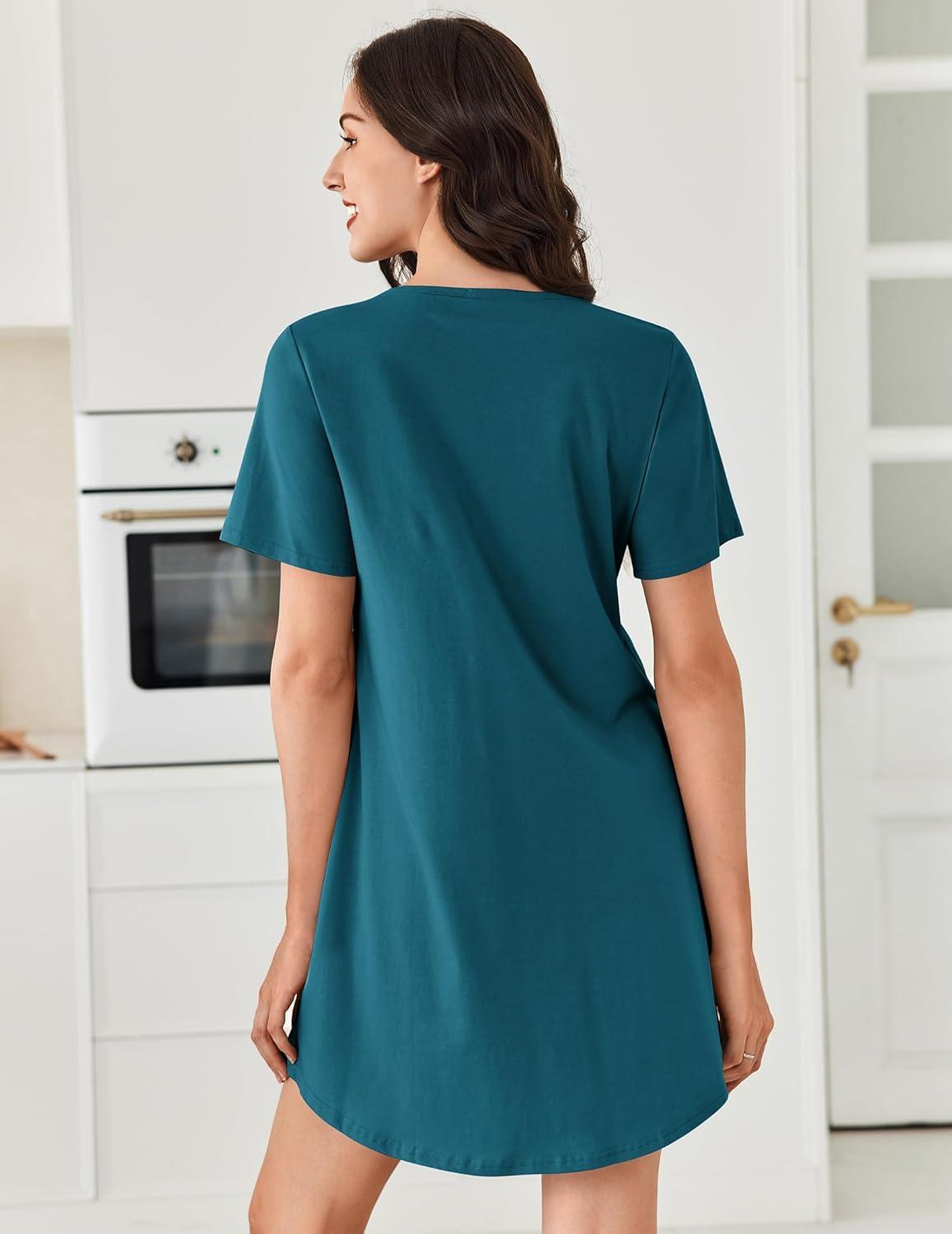 Ekouaer Nightgowns for Women Cotton Night Gowns Pleated Nightshirts Henley V Neck Sleepshirts Short Sleeve Sleepwear(Blue Green)