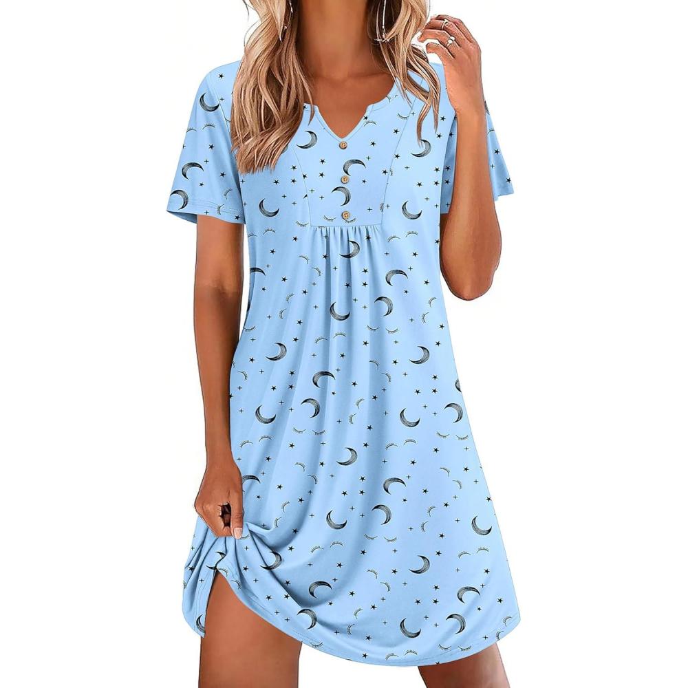 imageEkouaer Nightgowns for Women Cotton Night Gowns Pleated Nightshirts Henley V Neck Sleepshirts Short Sleeve SleepwearBlue Star  Moon