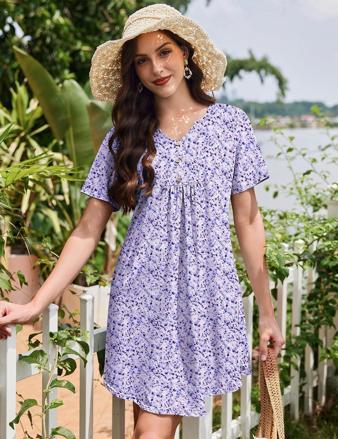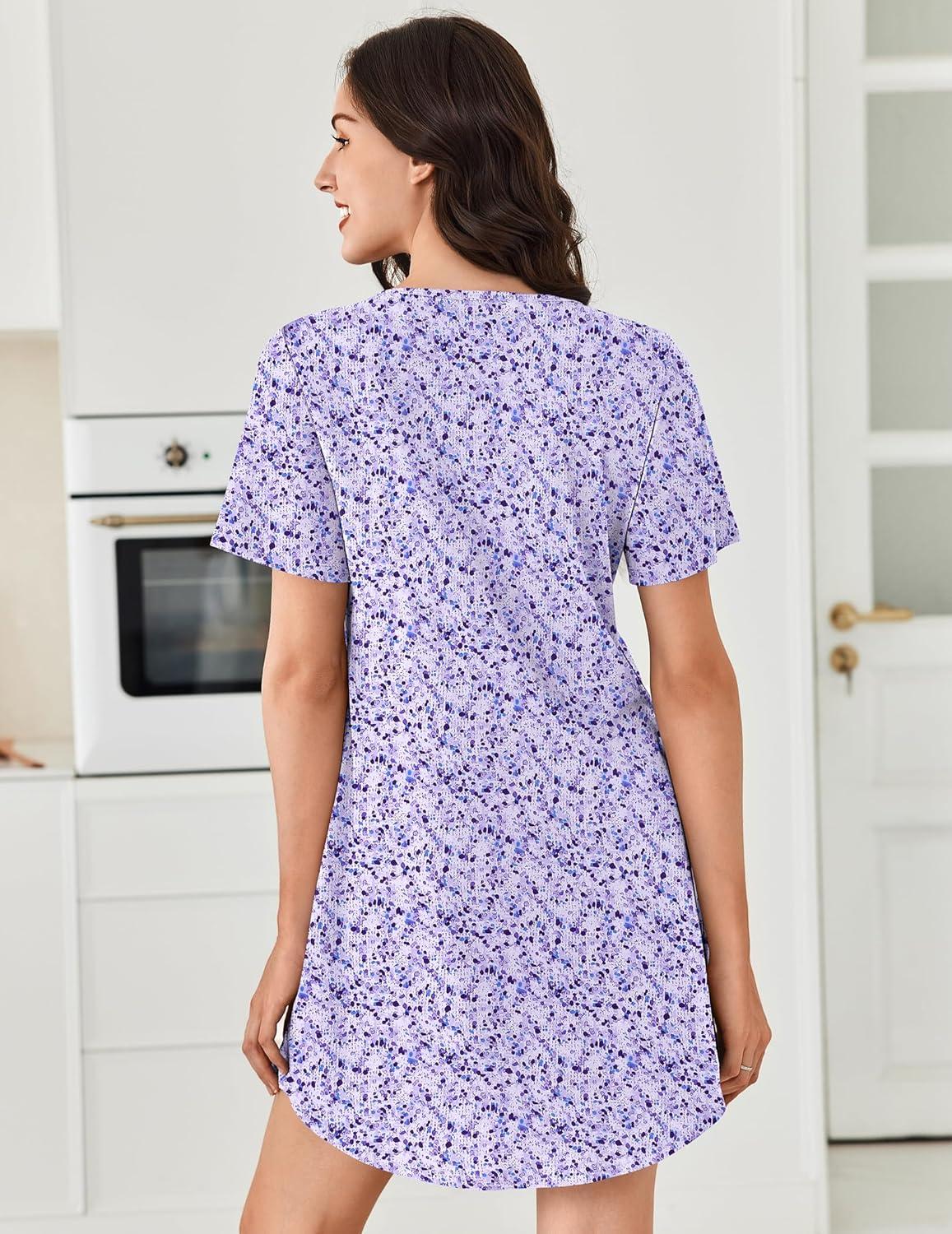Ekouaer Nightgowns for Women Cotton Night Gowns Pleated Nightshirts Henley V Neck Sleepshirts Short Sleeve Sleepwear(Purple & Blue Dots)