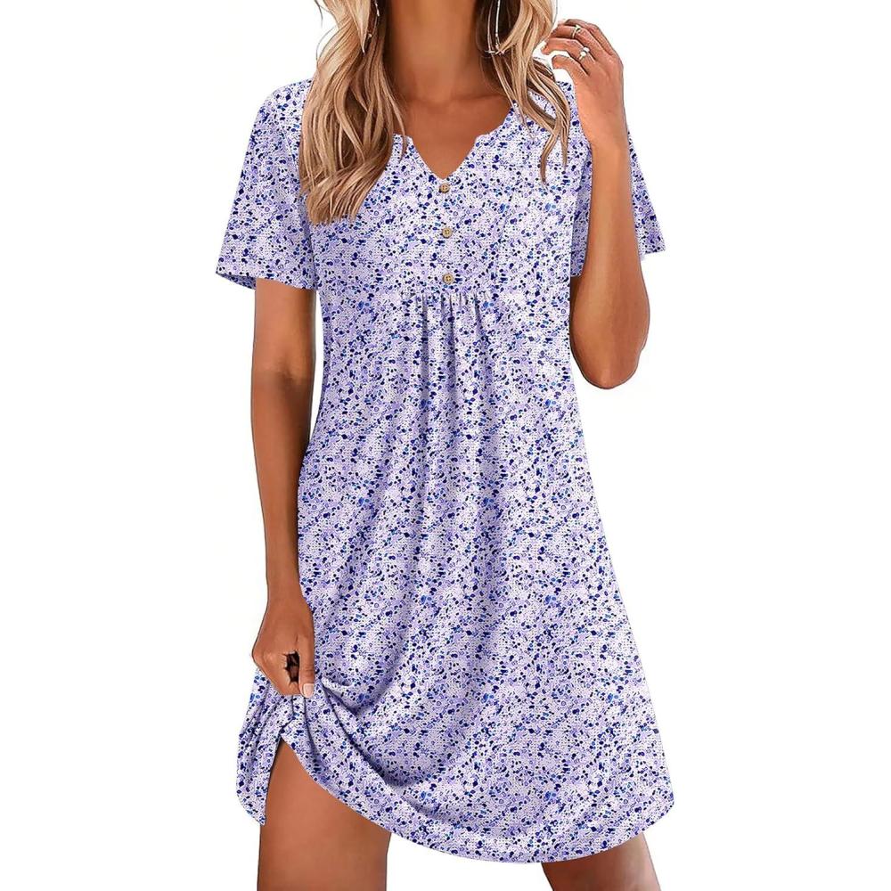 imageEkouaer Nightgowns for Women Cotton Night Gowns Pleated Nightshirts Henley V Neck Sleepshirts Short Sleeve SleepwearPurple  Blue Dots