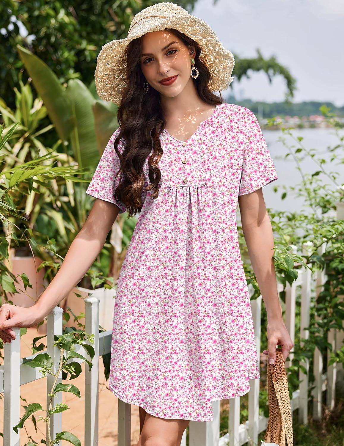 Ekouaer Nightgowns for Women Cotton Night Gowns Pleated Nightshirts Henley V Neck Sleepshirts Short Sleeve Sleepwear(White Pink Florals)
