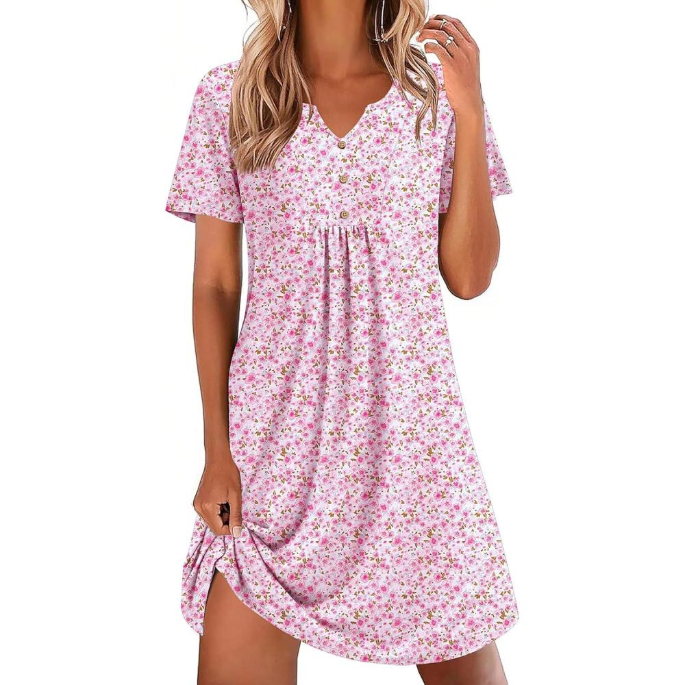 imageEkouaer Nightgowns for Women Cotton Night Gowns Pleated Nightshirts Henley V Neck Sleepshirts Short Sleeve SleepwearWhite Pink Florals