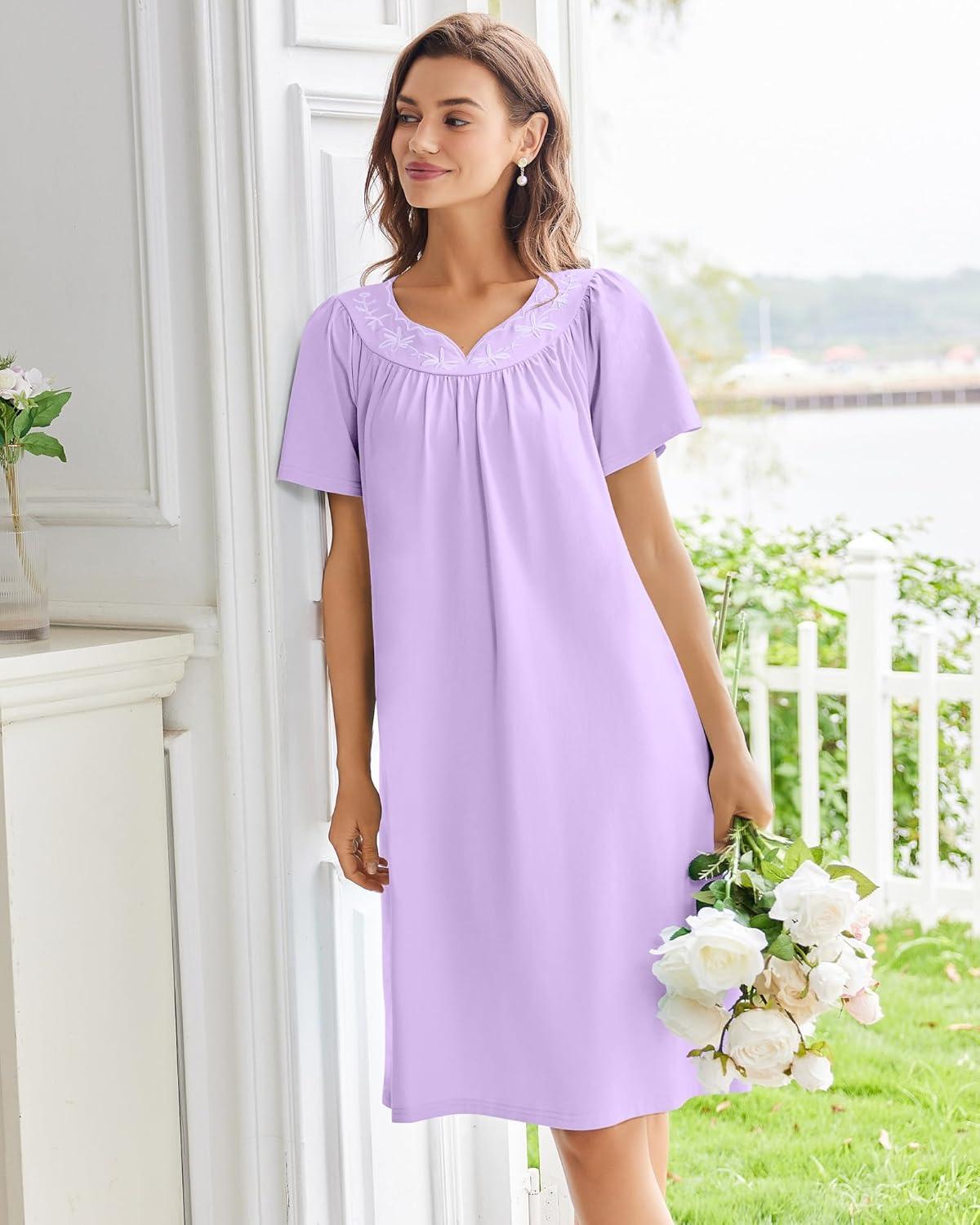 Ekouaer Nightgowns for Women Cotton Nightgown House Dress with Pockets Short Sleeve Mumu Dress Embroidered Lounge Dress(Light Purple)