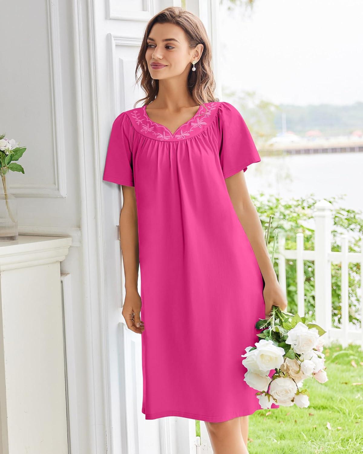 Ekouaer Nightgowns for Women Cotton Nightgown House Dress with Pockets Short Sleeve Mumu Dress Embroidered Lounge Dress(Rose Red)