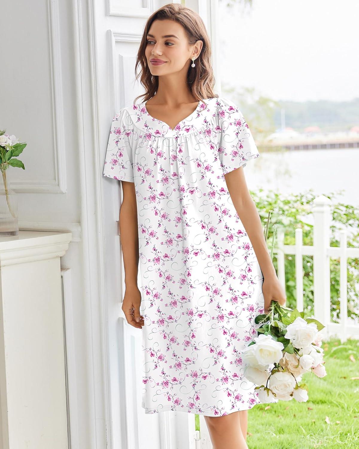 Ekouaer Nightgowns for Women Cotton Nightgown House Dress with Pockets Short Sleeve Mumu Dress Embroidered Lounge Dress(White Floral)