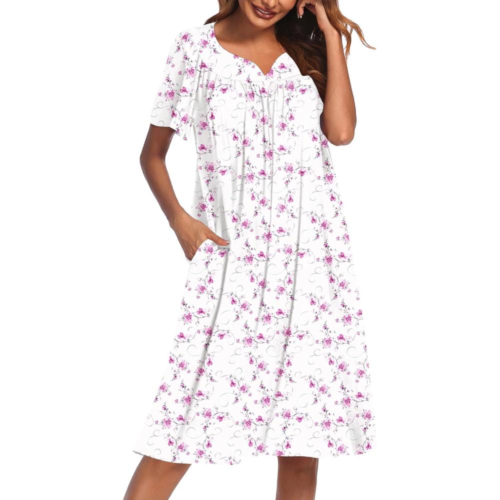 imageEkouaer Nightgowns for Women Cotton Nightgown House Dress with Pockets Short Sleeve Mumu Dress Embroidered Lounge DressWhite Floral