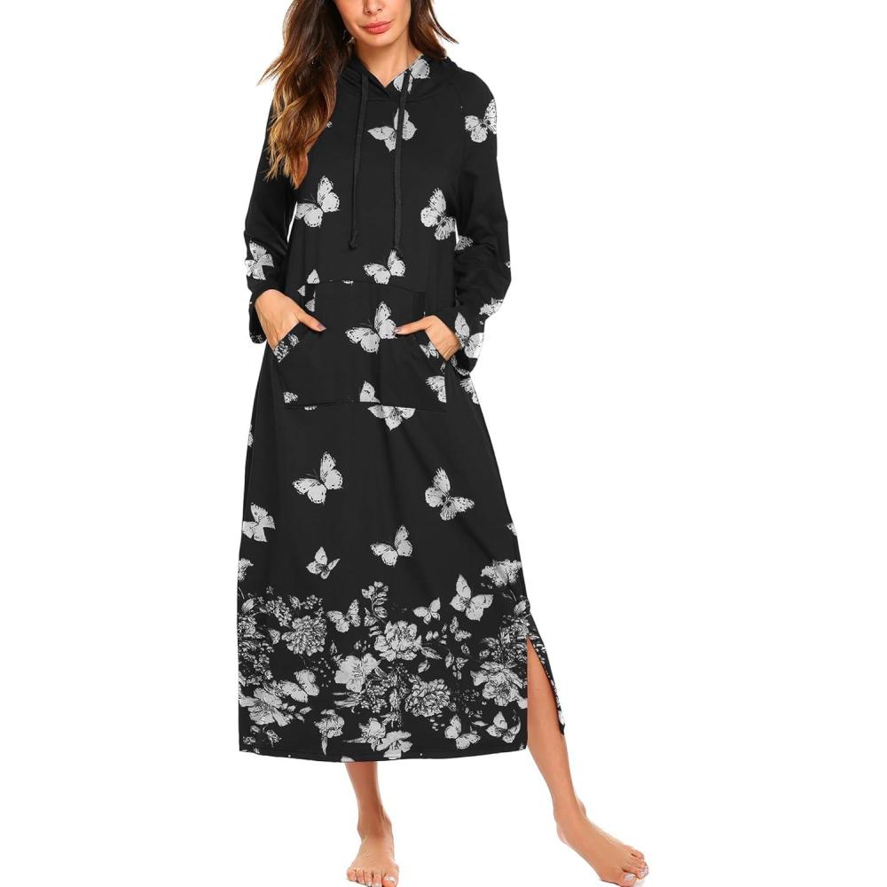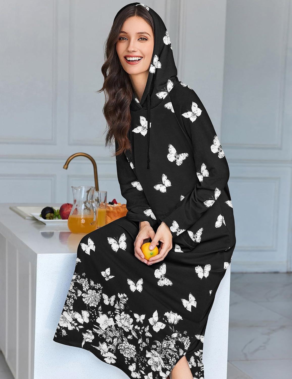 Ekouaer Nightgowns for Women Cotton Nightgown Long Sleeve Hooded Night Gown Contrast Color Full Length Loungewear with Pocket(Black Butterfly)