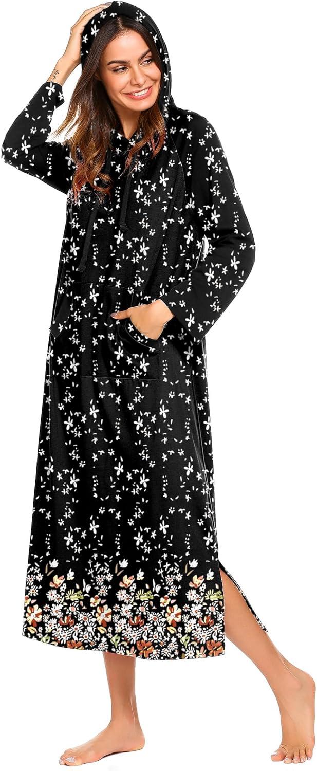 Ekouaer Nightgowns for Women Cotton Nightgown Long Sleeve Hooded Night Gown Contrast Color Full Length Loungewear with Pocket(Black Flowers)