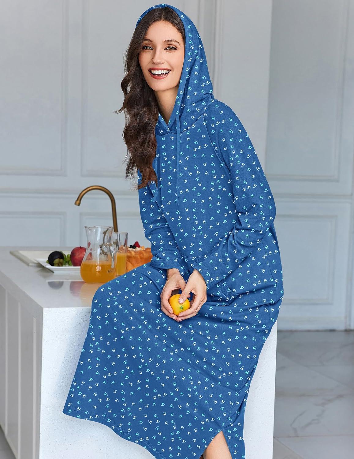 Ekouaer Nightgowns for Women Cotton Nightgown Long Sleeve Hooded Night Gown Contrast Color Full Length Loungewear with Pocket(Blue)