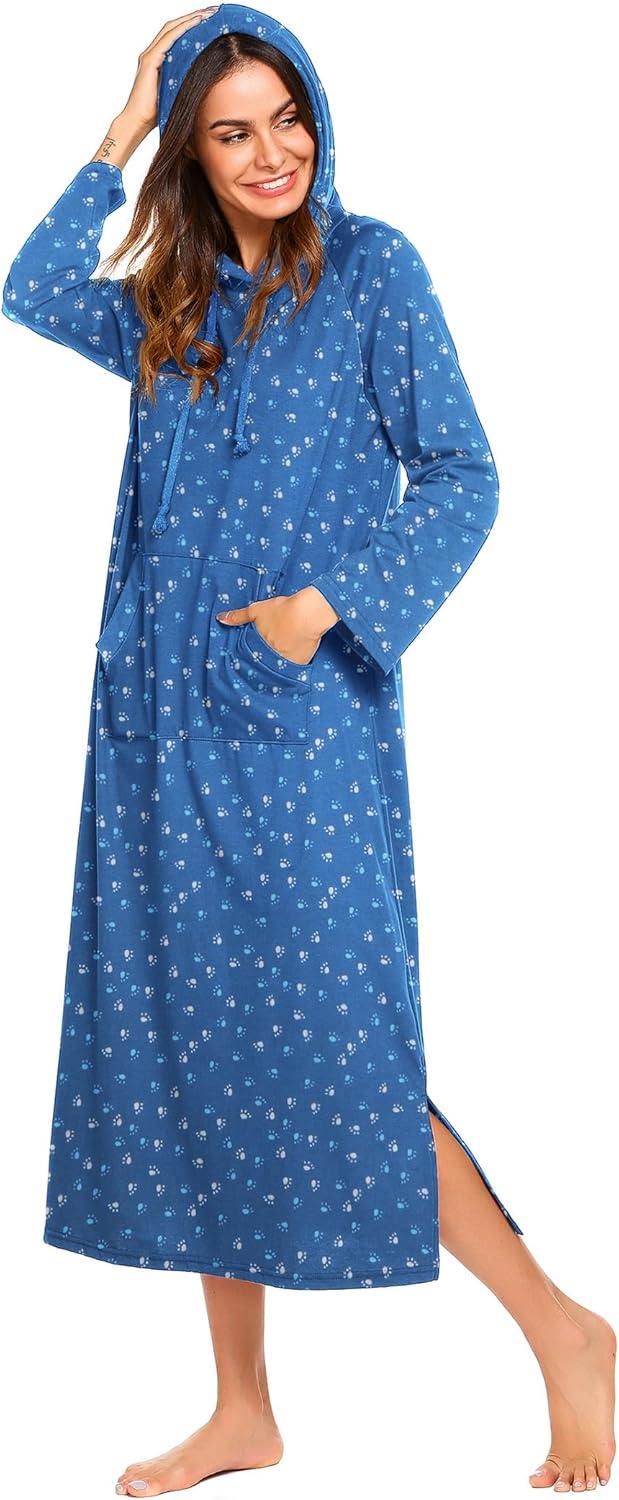 Ekouaer Nightgowns for Women Cotton Nightgown Long Sleeve Hooded Night Gown Contrast Color Full Length Loungewear with Pocket(Blue Dog Footprints)
