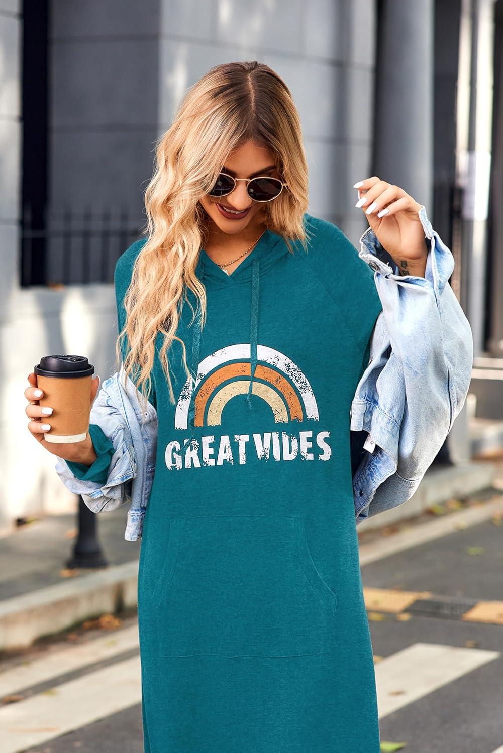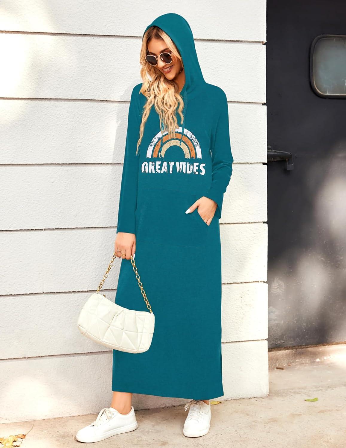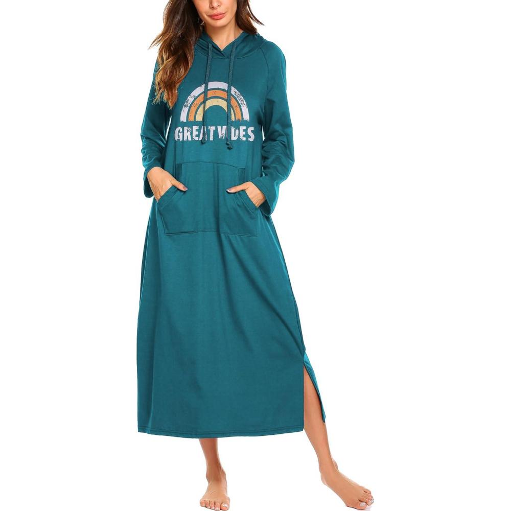 Ekouaer Nightgowns for Women Cotton Nightgown Long Sleeve Hooded Night Gown Contrast Color Full Length Loungewear with Pocket(Blue Green Rainbow)