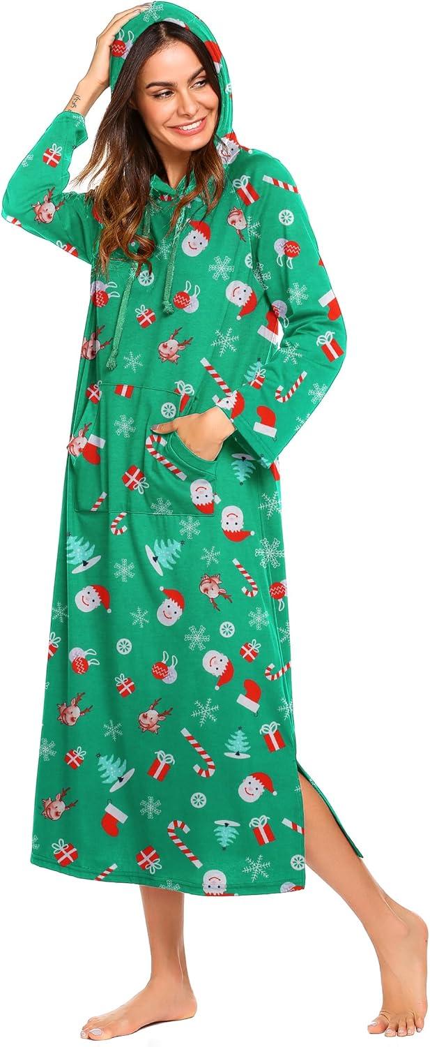 Ekouaer Nightgowns for Women Cotton Nightgown Long Sleeve Hooded Night Gown Contrast Color Full Length Loungewear with Pocket(Green Christmas Pattern)