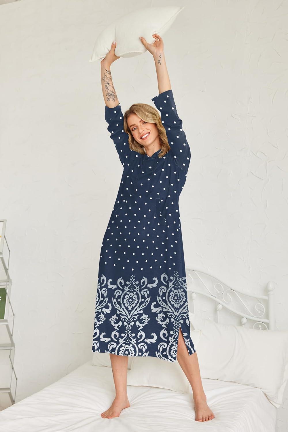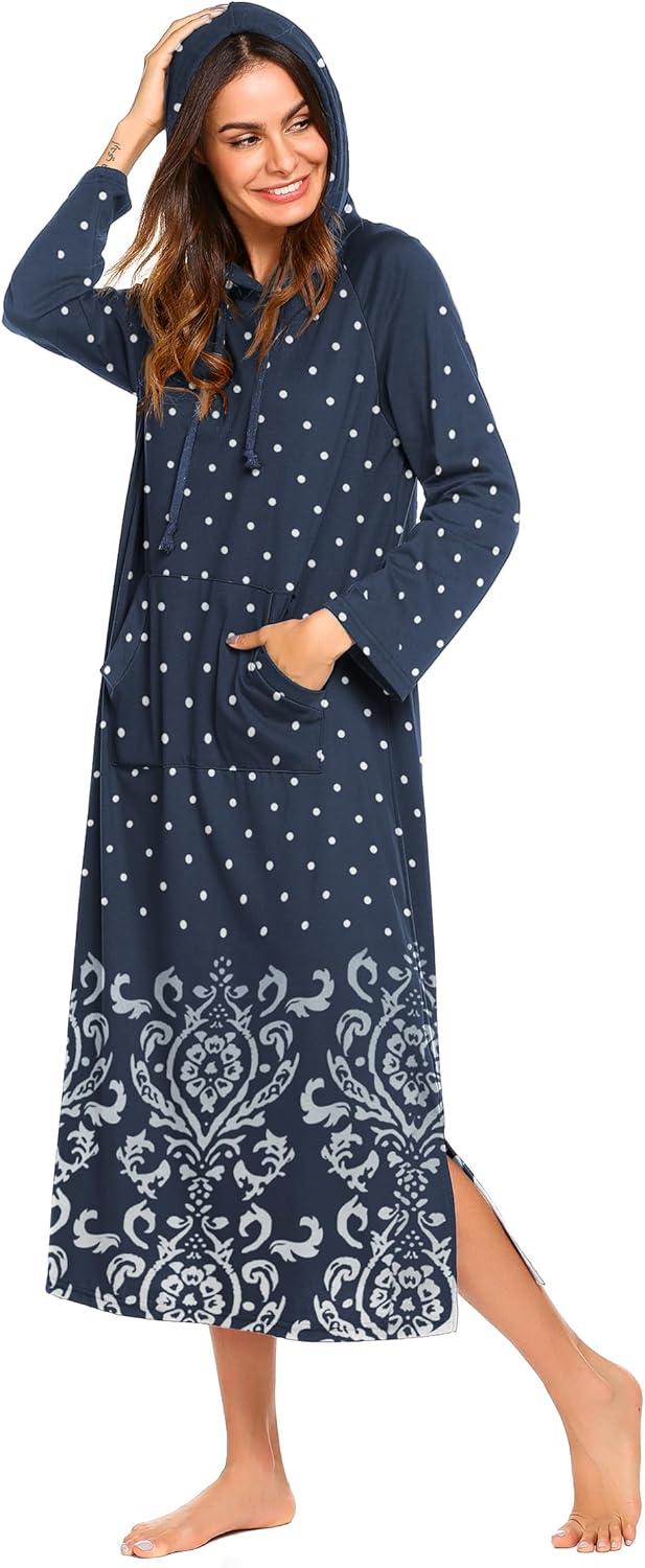 Ekouaer Nightgowns for Women Cotton Nightgown Long Sleeve Hooded Night Gown Contrast Color Full Length Loungewear with Pocket(Navy Dot)