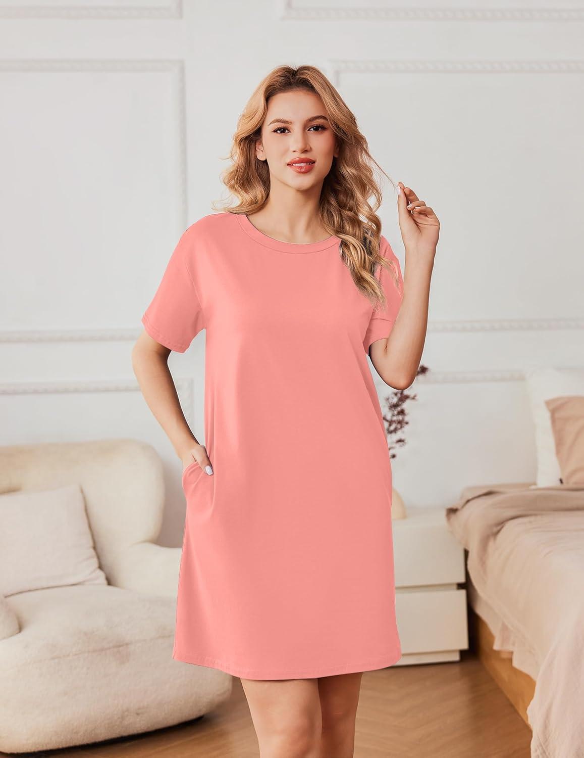 Ekouaer Nightgowns for Women Cotton Sleep Shirts Tshirt Nightshirt Casual Sleepdress Pullover Dress with Pockets S-3XL(Orange Pink)