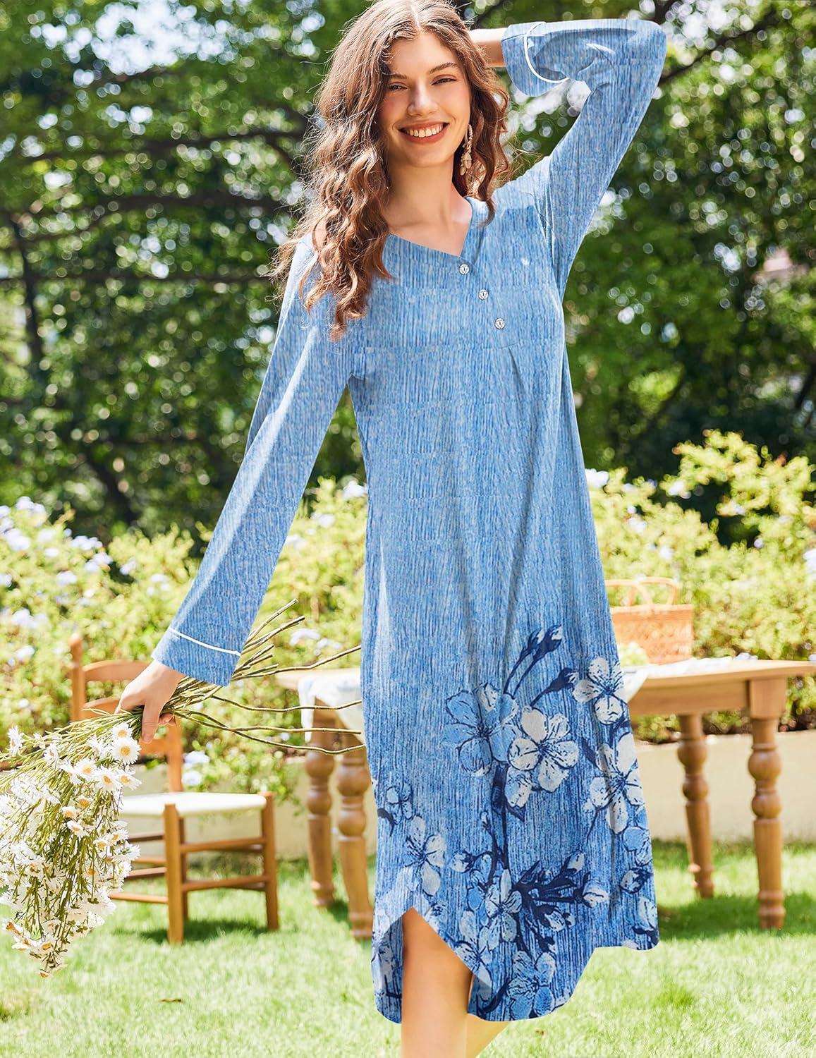 Ekouaer Nightgowns for Women Long Sleeve Nightgown Long Sleepwear Button Down Sleep Shirt Soft Night Gown S-4XL(Blue Floral)