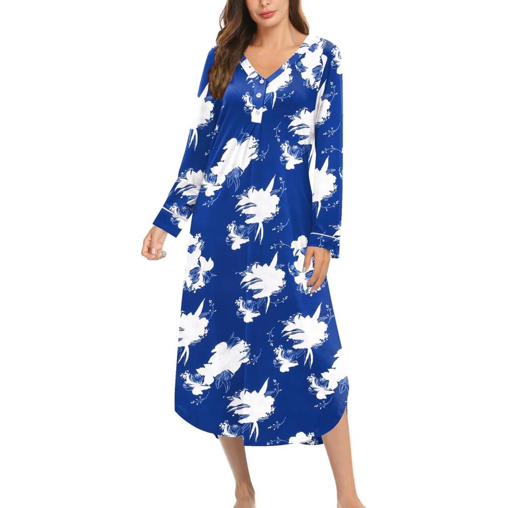 Ekouaer Nightgowns for Women Long Sleeve Nightgown Long Sleepwear Button Down Sleep Shirt Soft Night Gown S-4XL(Blue Flower)