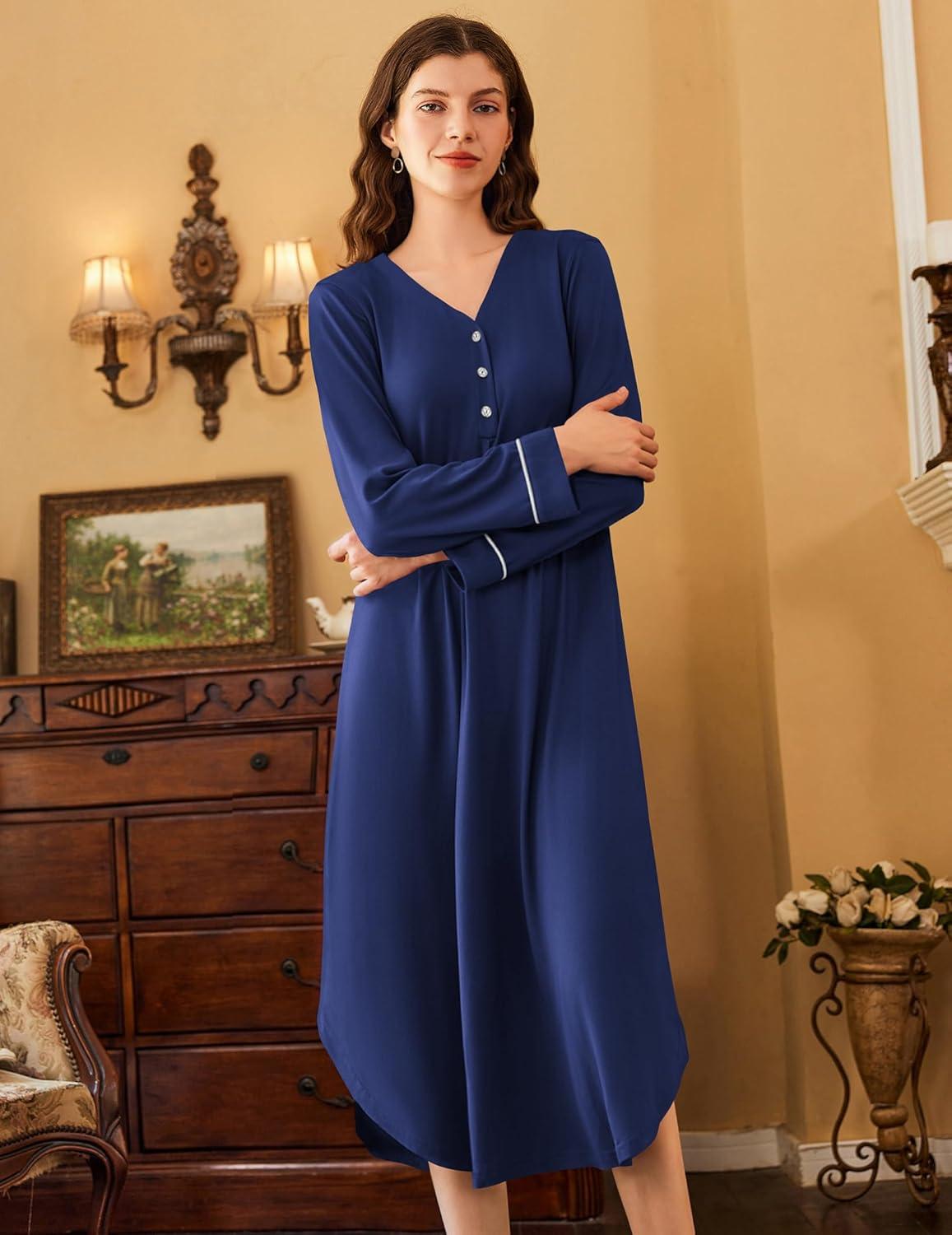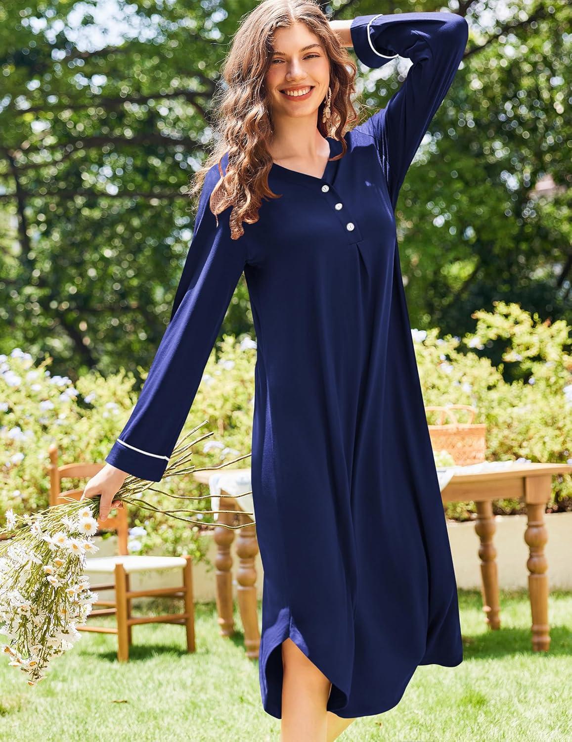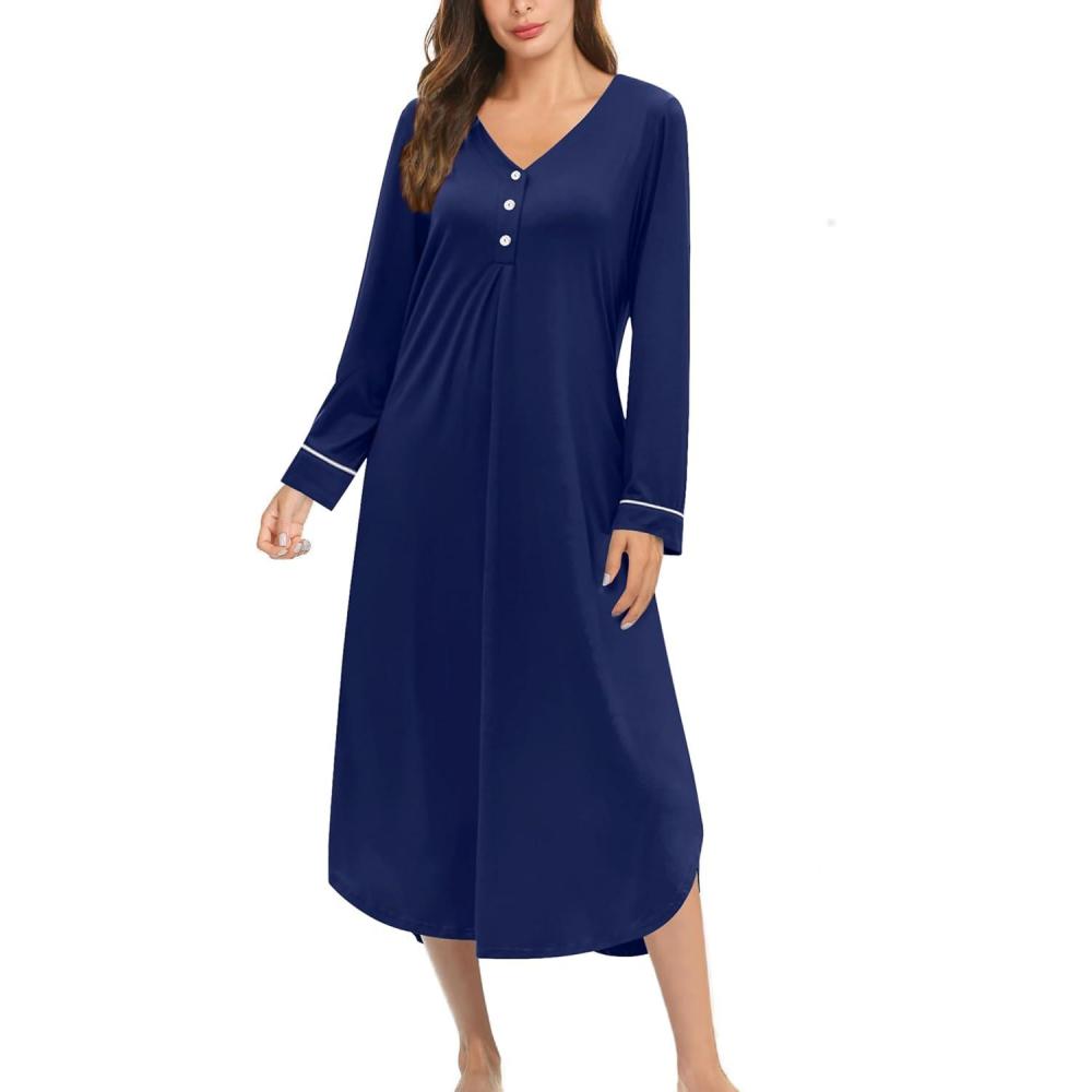 Ekouaer Nightgowns for Women Long Sleeve Nightgown Long Sleepwear Button Down Sleep Shirt Soft Night Gown S-4XL(Navy Blue)