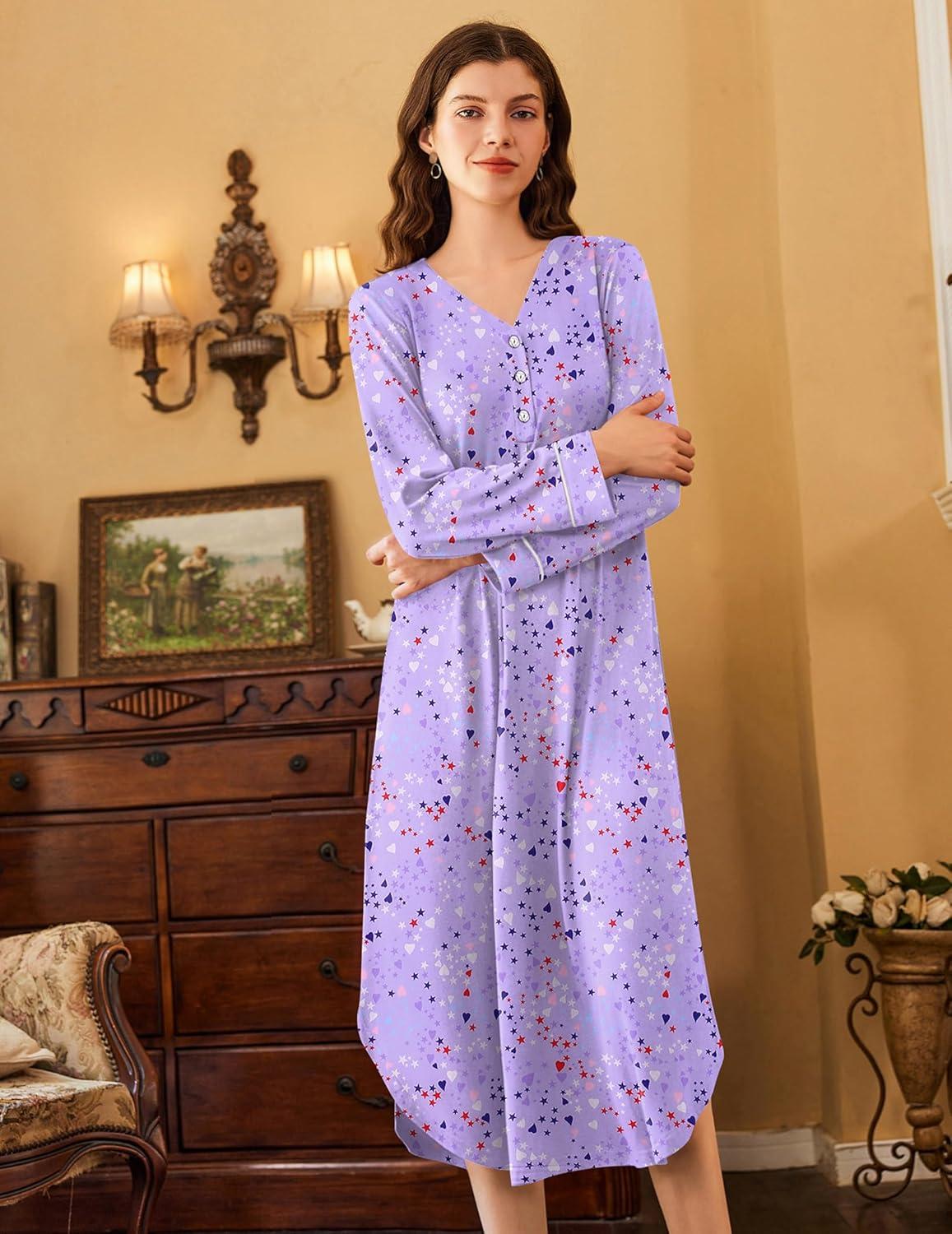 Ekouaer Nightgowns for Women Long Sleeve Nightgown Long Sleepwear Button Down Sleep Shirt Soft Night Gown S-4XL(Purple Stars)