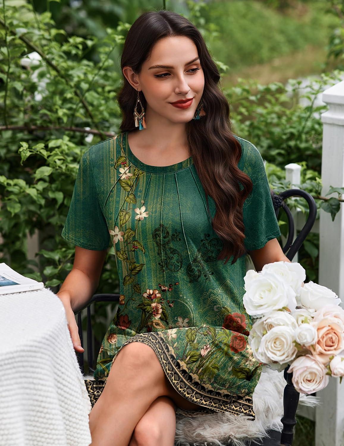 Ekouaer Nightgowns for Women Pleated Nightshirts Short Sleeve Sleepshirts Crew Neck Sleepwear Soft Night Gown Sleepdress(Green White Florals)