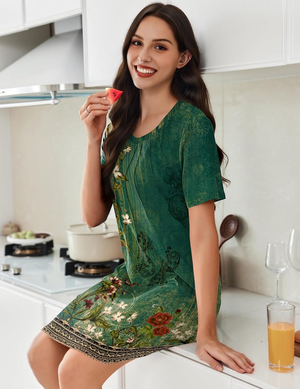 Ekouaer Nightgowns for Women Pleated Nightshirts Short Sleeve Sleepshirts Crew Neck Sleepwear Soft Night Gown Sleepdress(Green Pea Floral)