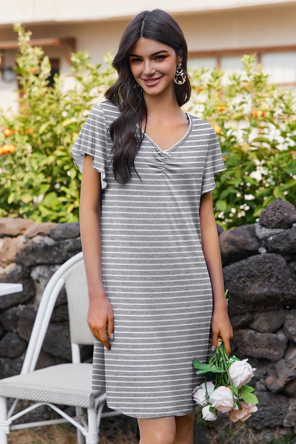 Ekouaer Nightgowns for Women Short Sleeve Night Gown Comfy Sleep Shirt Soft Sleep Dress Pleated Sleepwear(Gray Stripes)