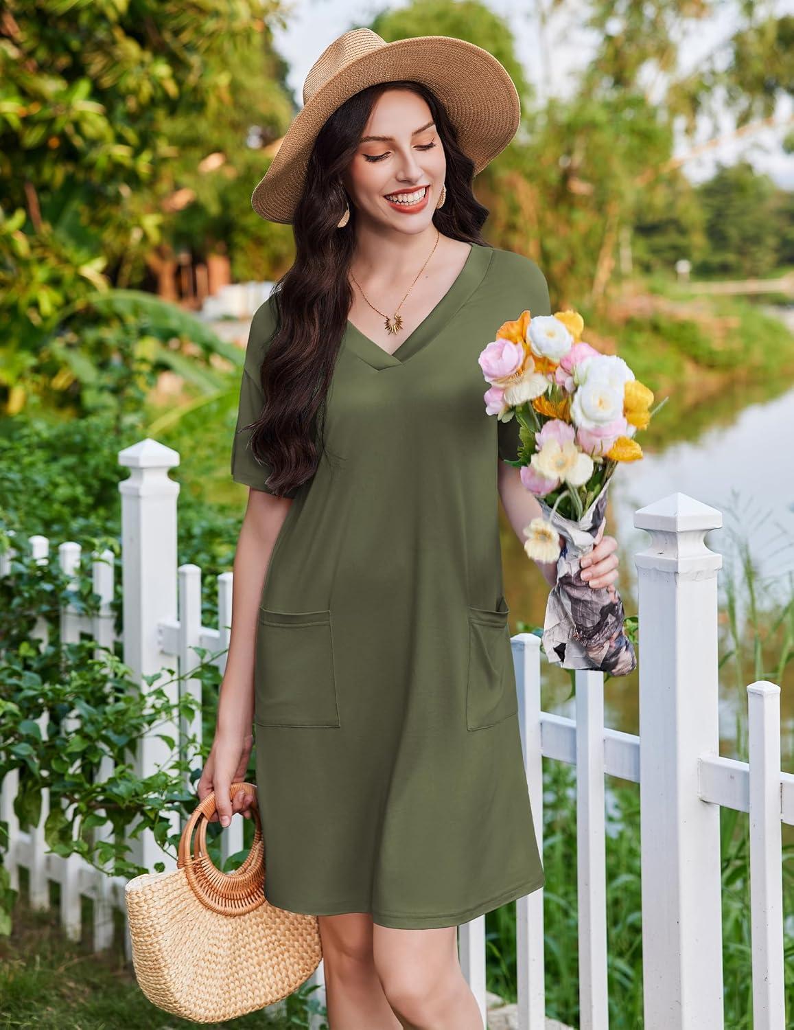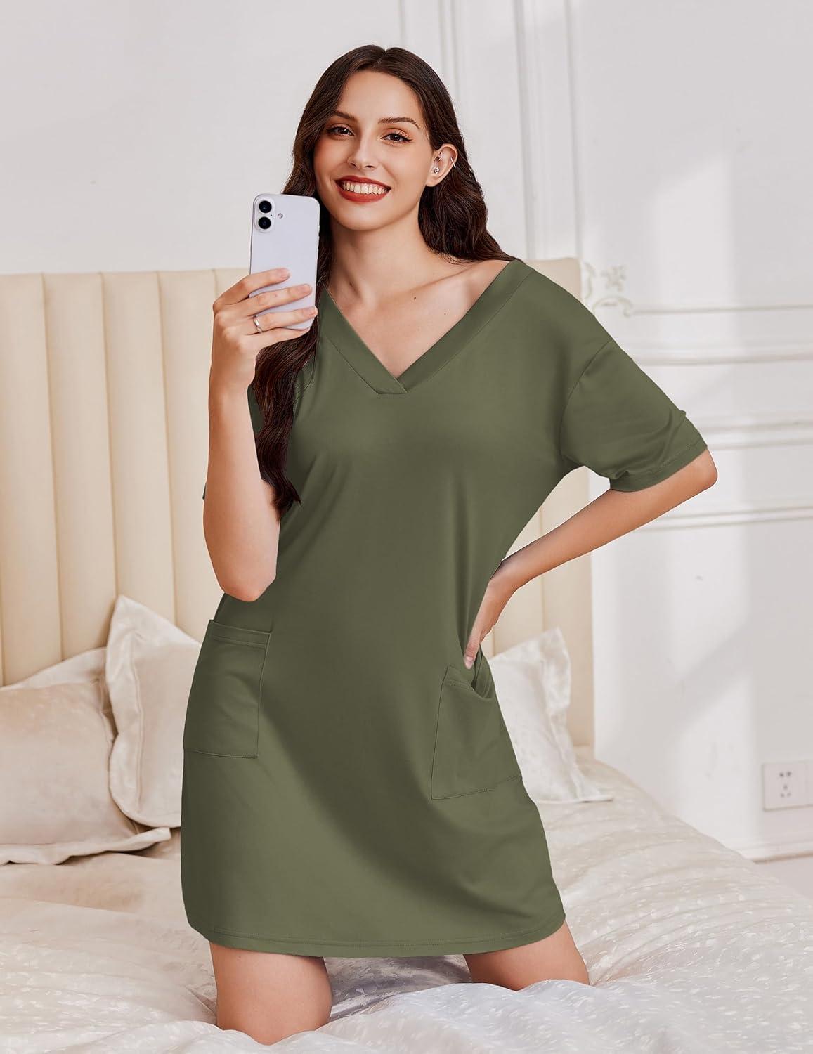 Ekouaer Nightgowns for Women Short Sleeve Sleep Shirt V Neck Night Gown With Pockets Soft Pajamas Dress Casual Sleepwear(Army Green)