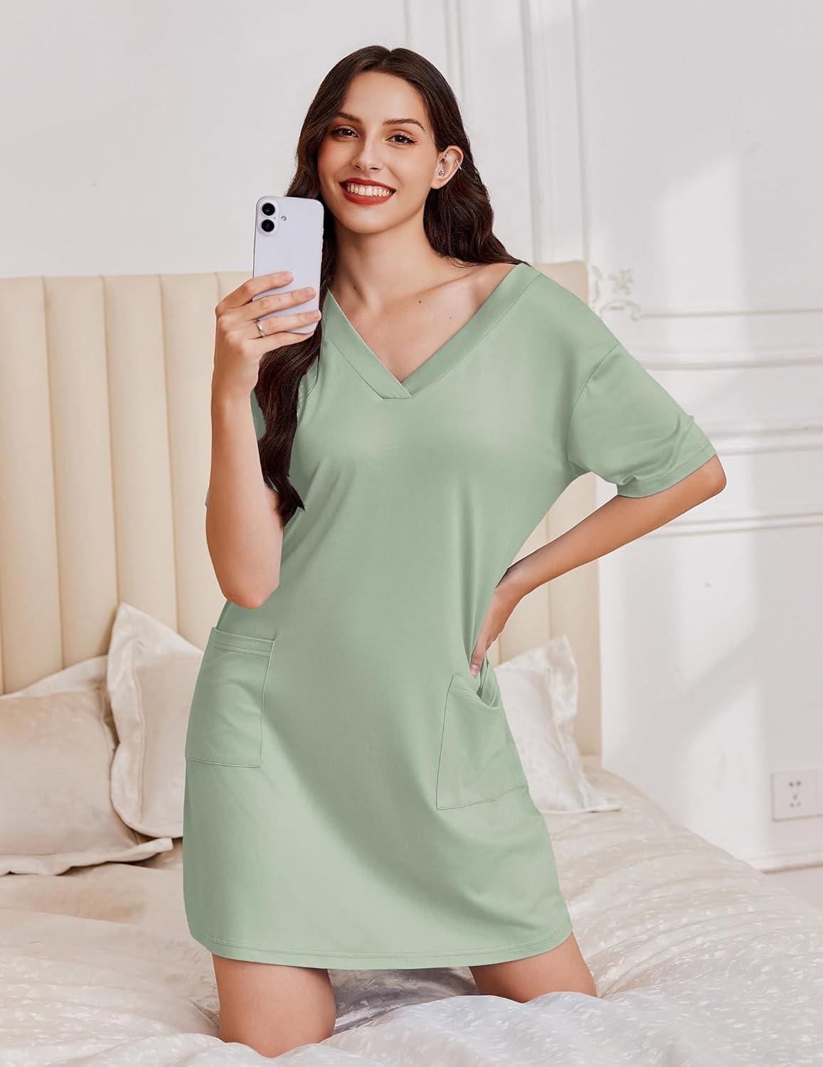 Ekouaer Nightgowns for Women Short Sleeve Sleep Shirt V Neck Night Gown With Pockets Soft Pajamas Dress Casual Sleepwear(Light Green)