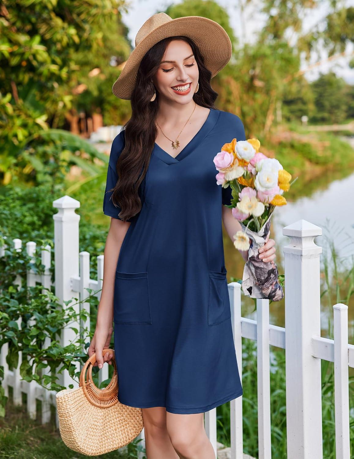Ekouaer Nightgowns for Women Short Sleeve Sleep Shirt V Neck Night Gown With Pockets Soft Pajamas Dress Casual Sleepwear(Navy Blue)
