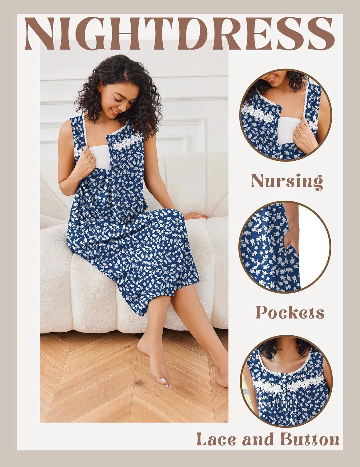 Ekouaer Nightgowns for Women Sleeveless House Dress Soft Victorian Nightgown Button Night Dress with Pockets S-XXL(Floral Navy Blue)
