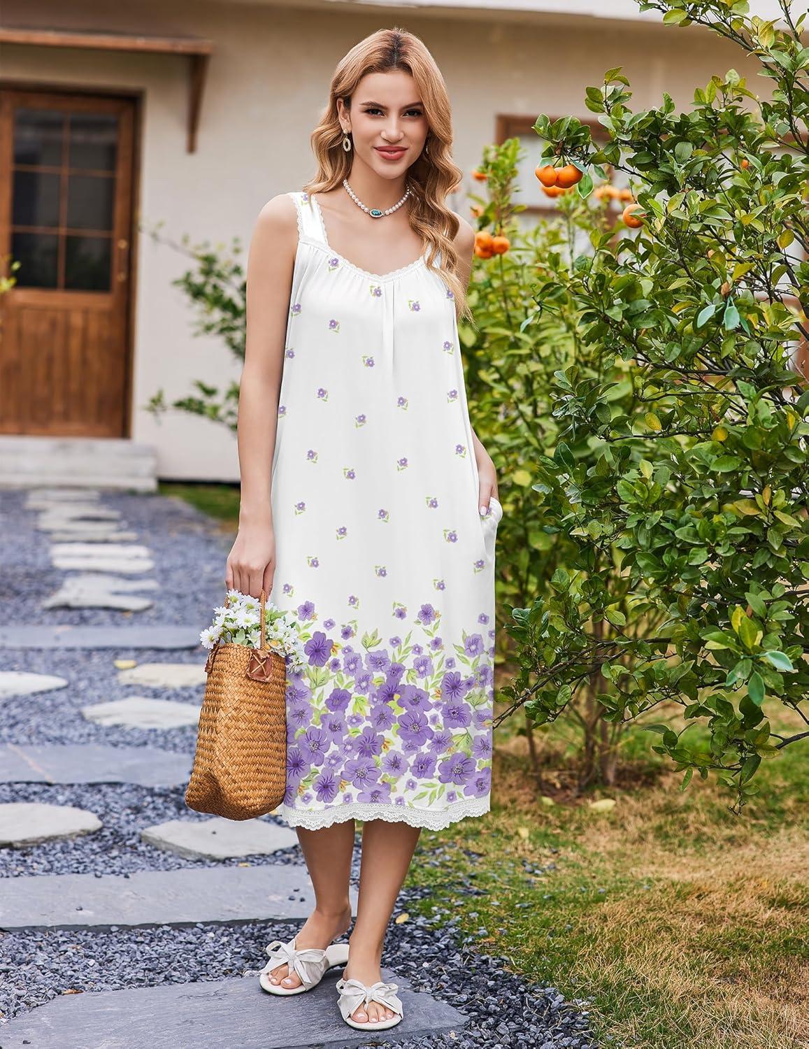 Ekouaer Nightgowns for Women Sleeveless Night Gown Victorian Sleep Shirt with Pockets Ladies Pjs Lace Trim Sleepwear S-XXL(Watercolor Flowers-purple)