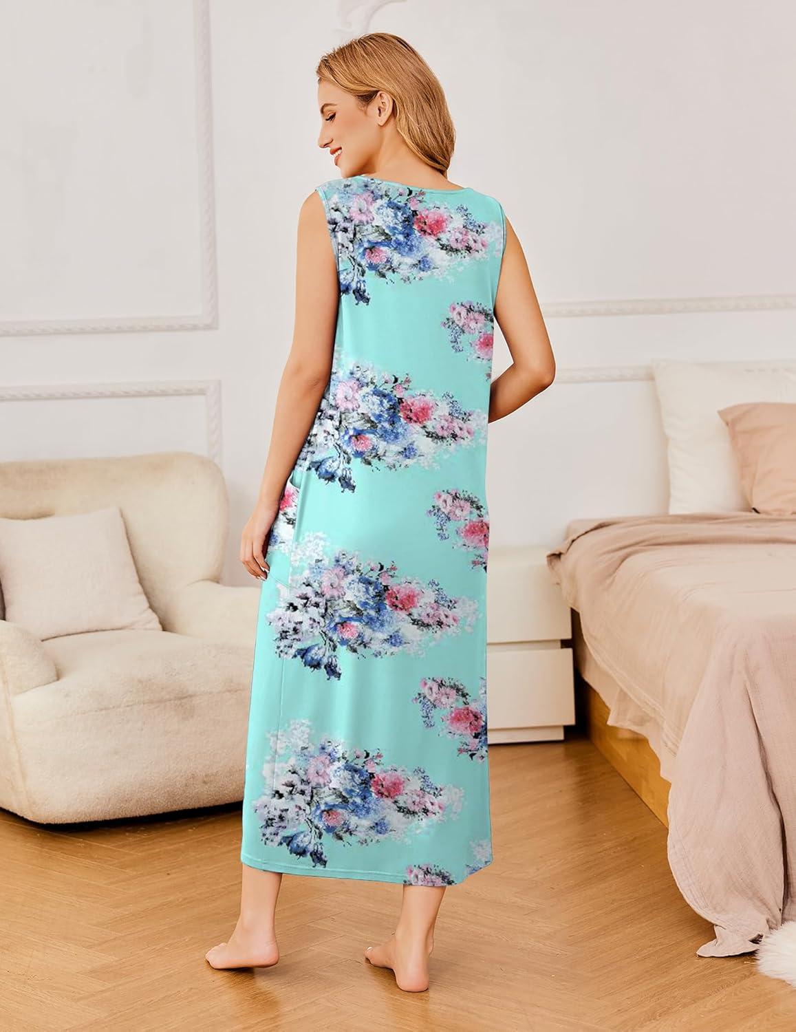 Ekouaer Nightgowns for Women Sleeveless Sleepshirt Long Print House Dress Tank Nightshirt Maxi Casual Dress with Pockets(Blue Multi Flowers)