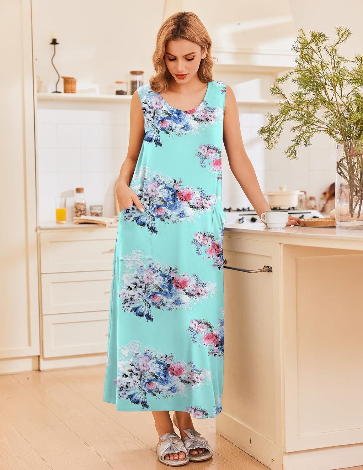 Ekouaer Nightgowns for Women Sleeveless Sleepshirt Long Print House Dress Tank Nightshirt Maxi Casual Dress with Pockets(Blue Flower)