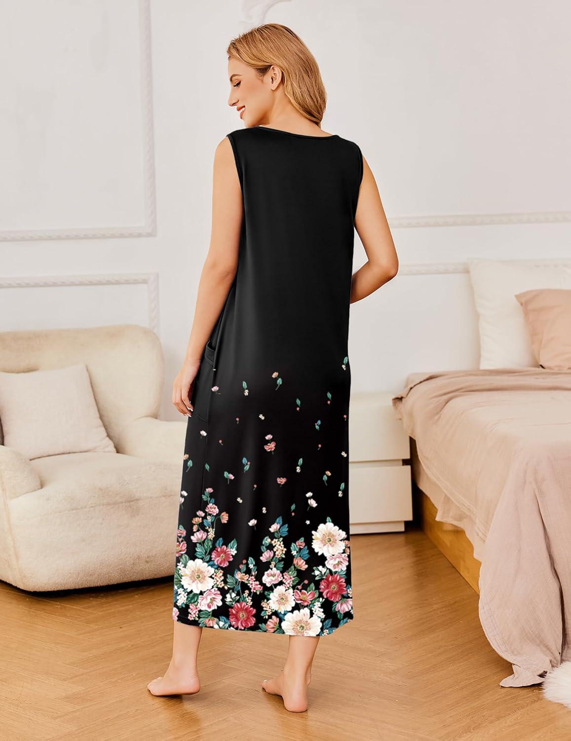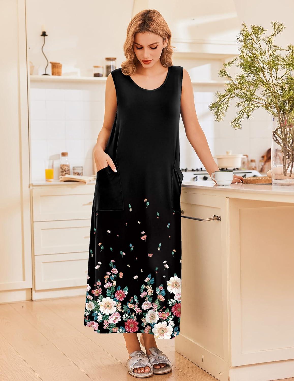 Ekouaer Nightgowns for Women Sleeveless Sleepshirt Long Print House Dress Tank Nightshirt Maxi Casual Dress with Pockets(Flower Black)
