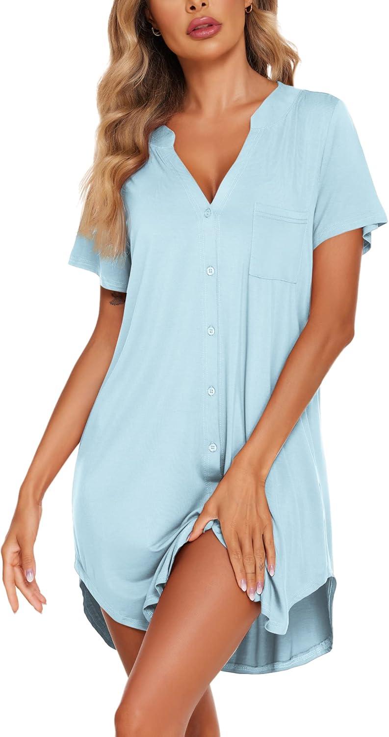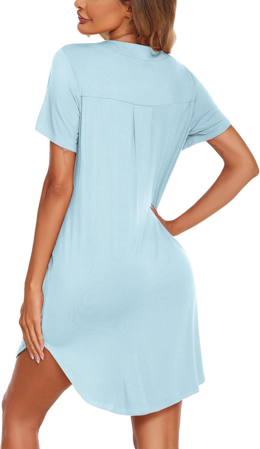Ekouaer Nightgowns for Women Soft Cotton Sleep Shirt Short Sleeve Button Down Nightshirt(Light Blue)