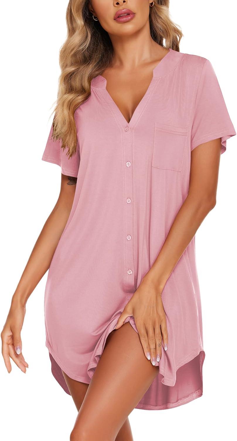 Ekouaer Nightgowns for Women Soft Cotton Sleep Shirt Short Sleeve Button Down Nightshirt(Pink)