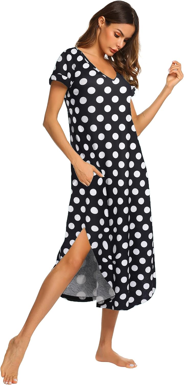 Ekouaer Nightgowns for Women V Neck Nightshirts Short Sleeve Soft Sleepwear Side Split Pockets Long Nightdress S-3XL(Pat8 Black With White Dots)