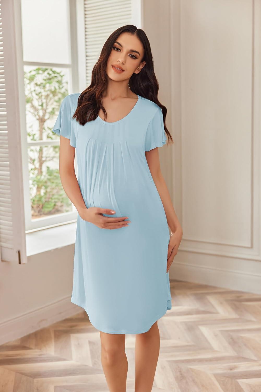 Ekouaer Nursing Nightown Labor and Delivery Gown for Hospital Pleated Breastfeeding Dress Short Sleeve Maternity Sleepwear(Light Blue)