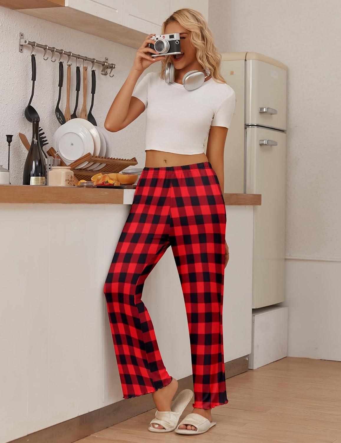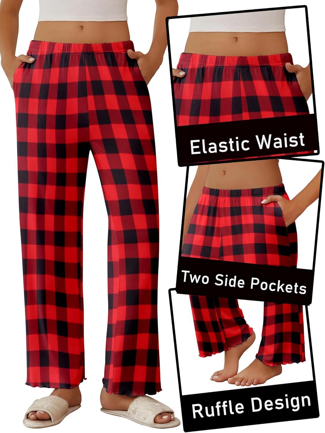 Ekouaer Pajama Pants Women Soft Casual Lounge Pajama Bottoms Comfy Stretch Sleep Pants Wide Leg Pj Bottoms with Pockets(Black Red Plaid)