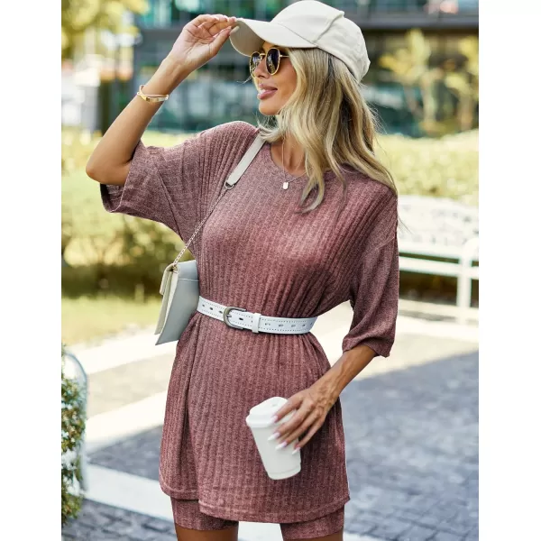 Ekouaer Pajamas 2 Piece Lounge Sets Ribbed Knit Matching Outfits T-shirt Biker Shorts Sleepwear Loungewear Sweatsuits(Burgundy)