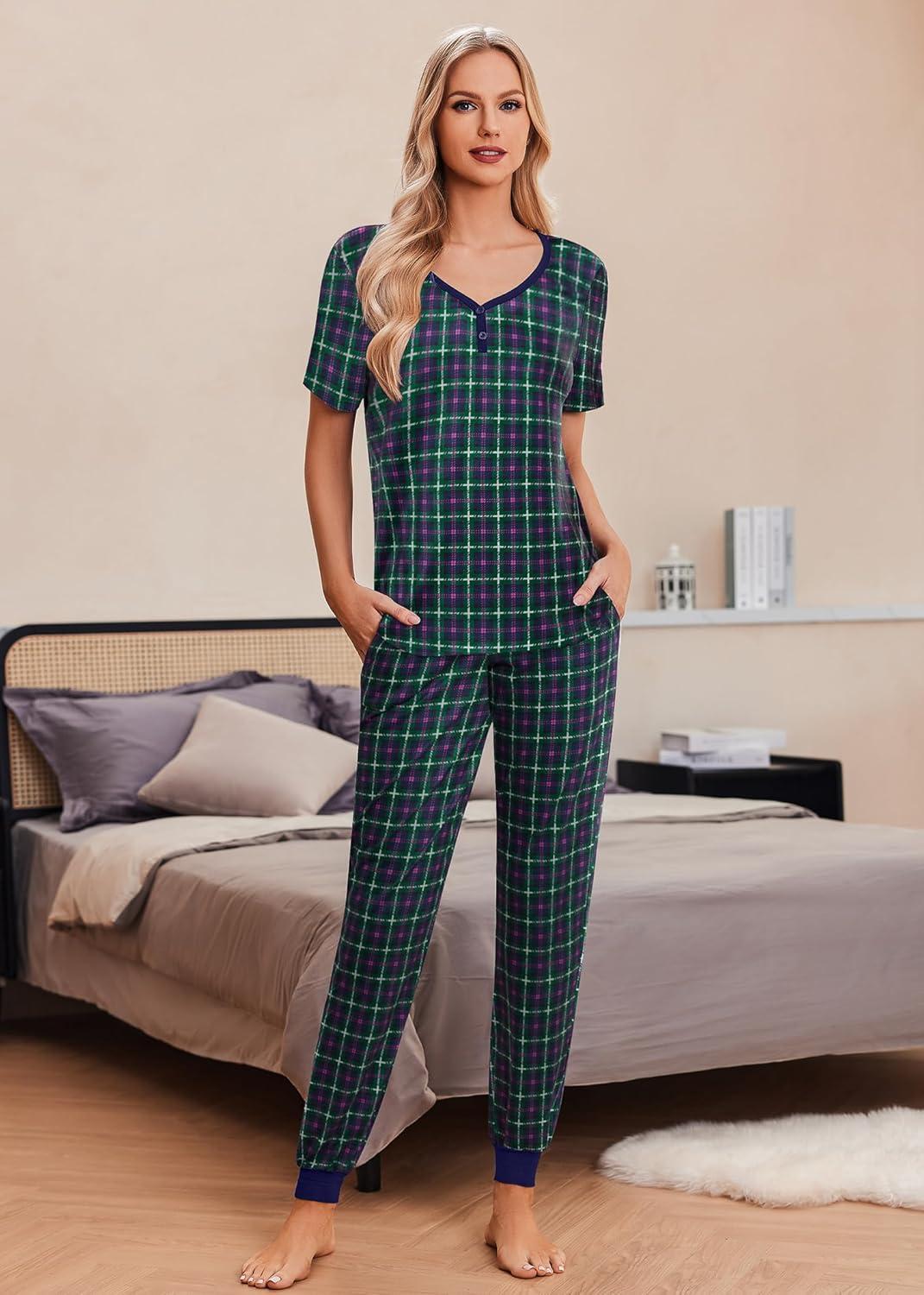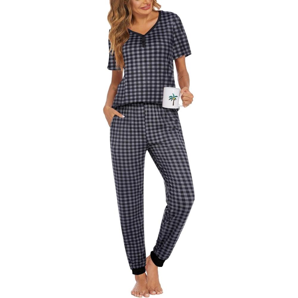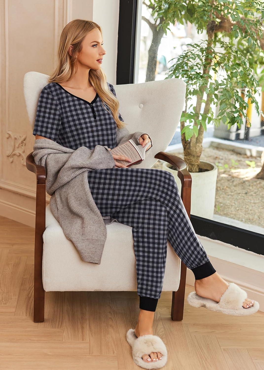 Ekouaer Pajamas for Women Set 2 Piece Lounge Set Short Sleeve Pjs Joggers Long Pants Sleepwear with Pockets(Black Plaid)