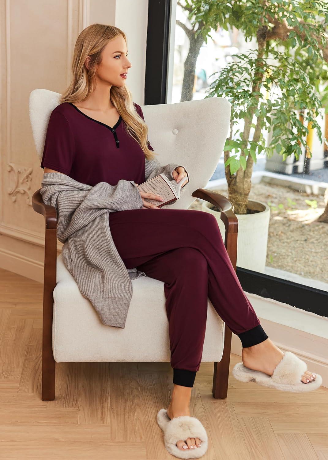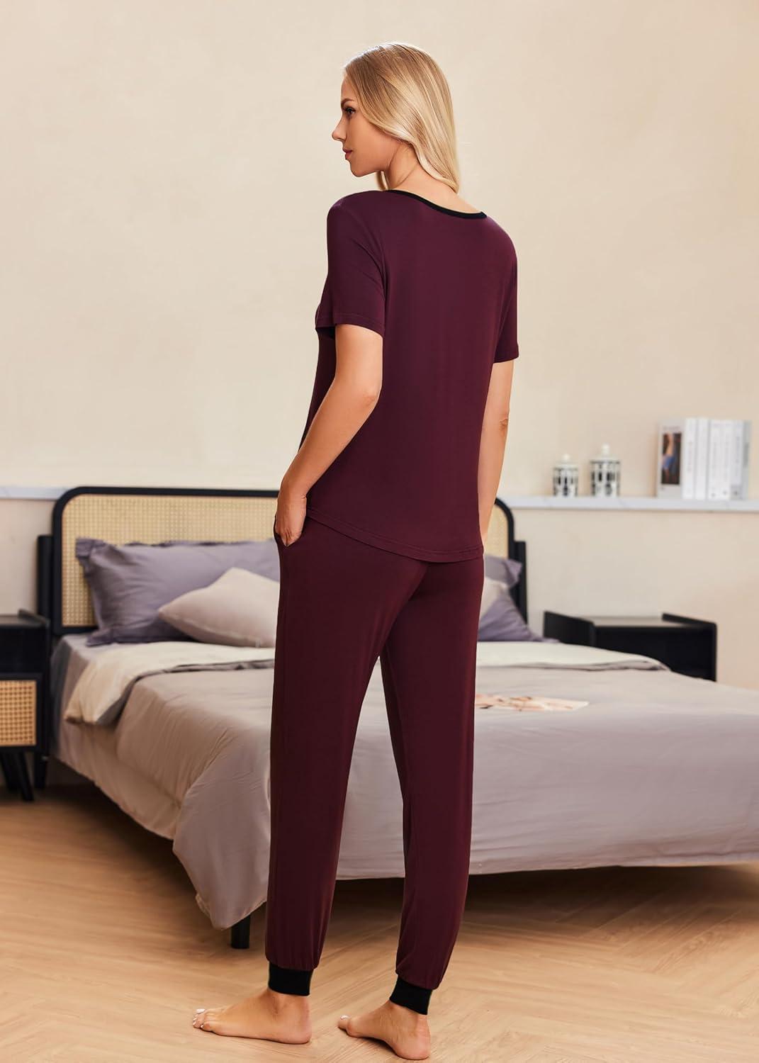 Ekouaer Pajamas for Women Set 2 Piece Lounge Set Short Sleeve Pjs Joggers Long Pants Sleepwear with Pockets(Dark Red)