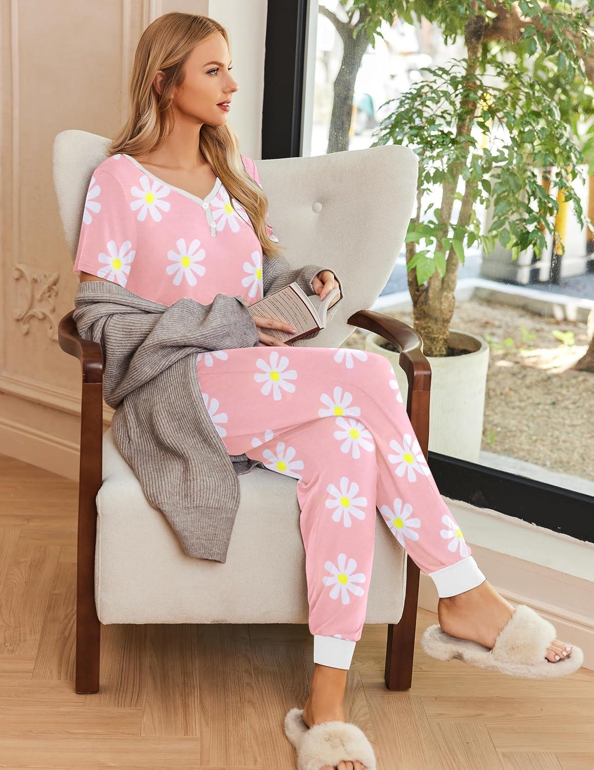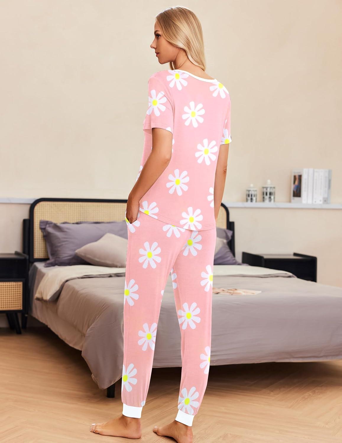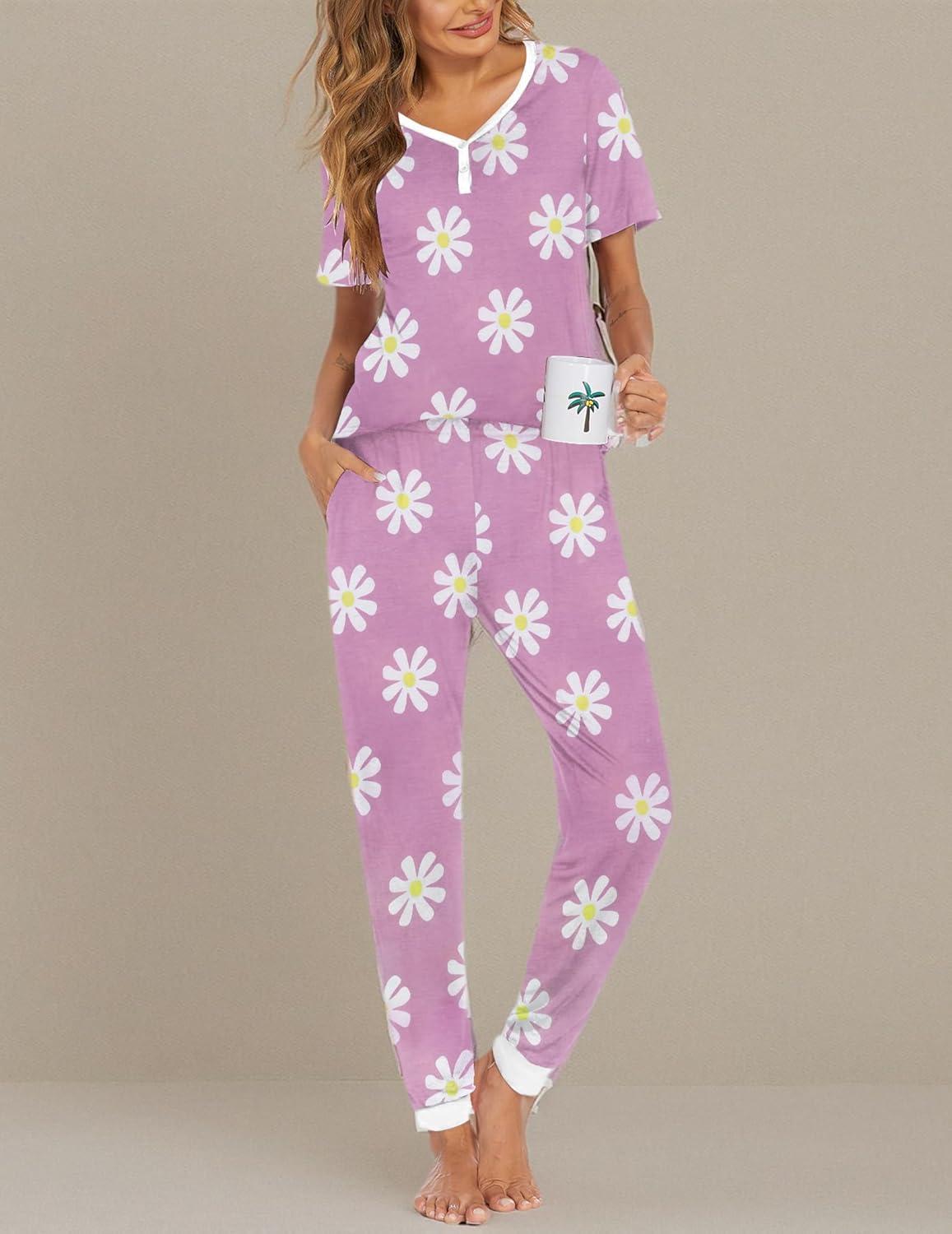 Ekouaer Pajamas for Women Set 2 Piece Lounge Set Short Sleeve Pjs Joggers Long Pants Sleepwear with Pockets(Light Purple Flower)